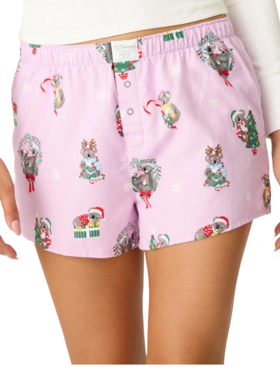 Lavender boxer-style PJ shorts with a playful koala pattern. Made from soft, breathable fabric. Features a relaxed fit and elastic waistband for comfort. Perfect for lounging or sleeping.