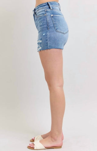 Judy Blue - High Waist Denim Shorts With Stitch Over Destroy Detail