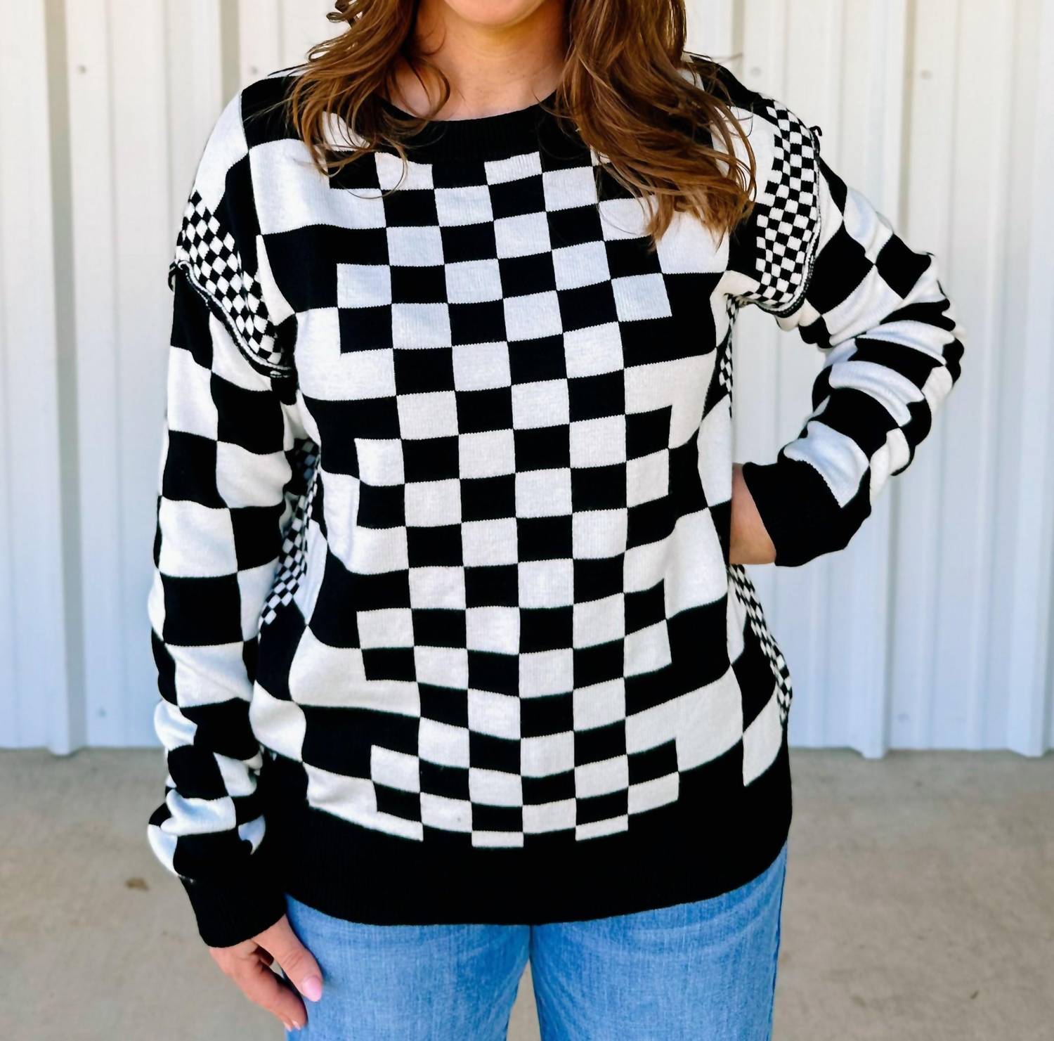 Experience the perfect blend of comfort and style with this trendy crew neck sweater, designed to effortlessly elevate your wardrobe. Pair it with your favorite denim and loafers for the perfect look. Timeless black and white checkered print. Offers a blend of comfort and style. Features long sleeves and a classic round neck. Composed of 50% Viscose, 28% Polyester, 22% Polyamide. Pull on. Hand wash.