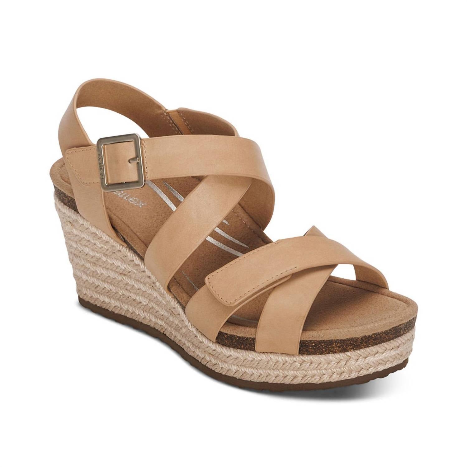 Dresses, denim, shorts... these wedges go with just about anything. Expertly crafted to combine style with superior support, these sandals feature genuine leather in an elegant sand color, with a 3-inch wedge heel for added height and flair. The open-toe design includes criss-cross band detailing and adjustable hook and loop closures to ensure the perfect fit. With integrated arch support and a memory foam footbed, each shoe is anatomically designed to provide premium comfort, bringing an ideal blend of fashion-forward design and functionality.
