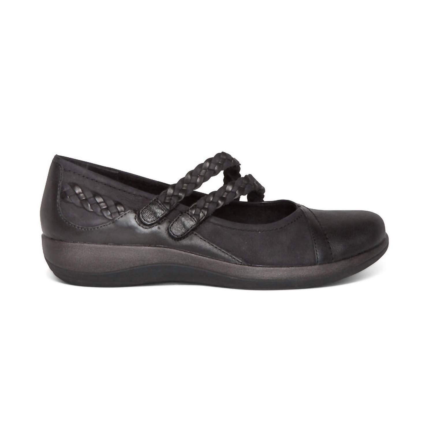 These shoes feature hook & loop closures for adjustability, ensuring a personalized fit. The upper is crafted from genuine leather, offering durability and a classic look. A cork and EVA blend in the midsole provides extra comfort and support. The outsole is made of rubber, which offers traction and durability for various surfaces. The insole is removable, allowing for customization or replacement with orthotics if desired. The heel height measures approximately 1.3 inches.