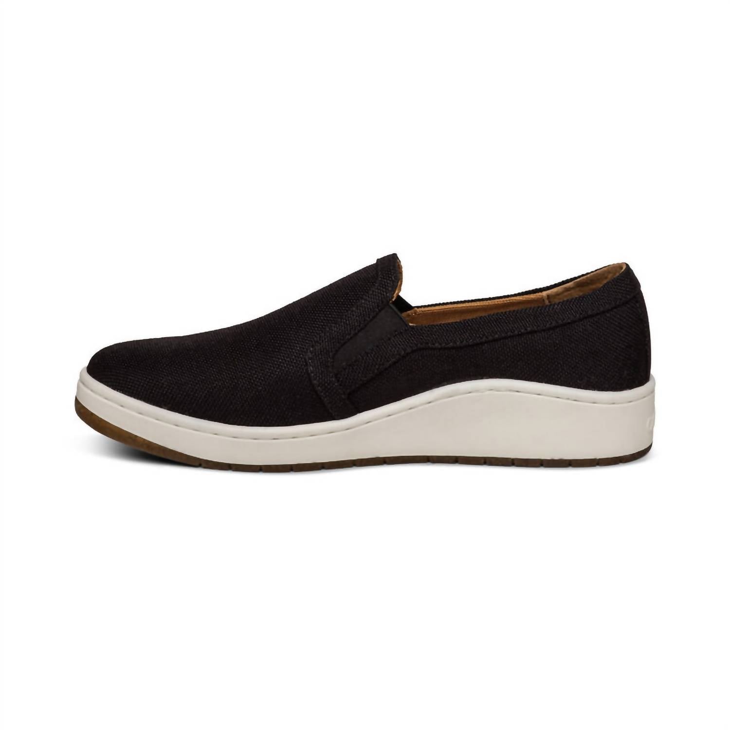 Classic slip-on sneaker features Cobra Orthotic Technology and twin goring. UltraSky™ cushioning and lined with microfiber treated with antimicrobial technology insole. Shimmery canvas upper. Rubber midsole. Cork and rubber blend outsole. Removable insole. .75" Heel height. Padded heel.