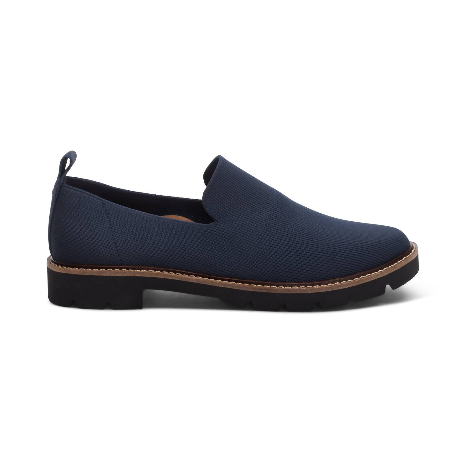 Loafers so versatile you can wear them with just about anything. Step into comfort with the Women's Chloe Slip On Loafer by Aetrex, featuring a durable stretch knit upper for breathability and a lightweight construction outsole for easy wear. Arch support built into every pair helps stabilize and align your feet, relieving common foot pain and plantar fasciitis. The memory foam footbed ensures plush cushioning with every step, complemented by a 1.25” flat heel for added stability. These loafers are perfect for all-day wear with their stylish round toe design and no need for insole removal.