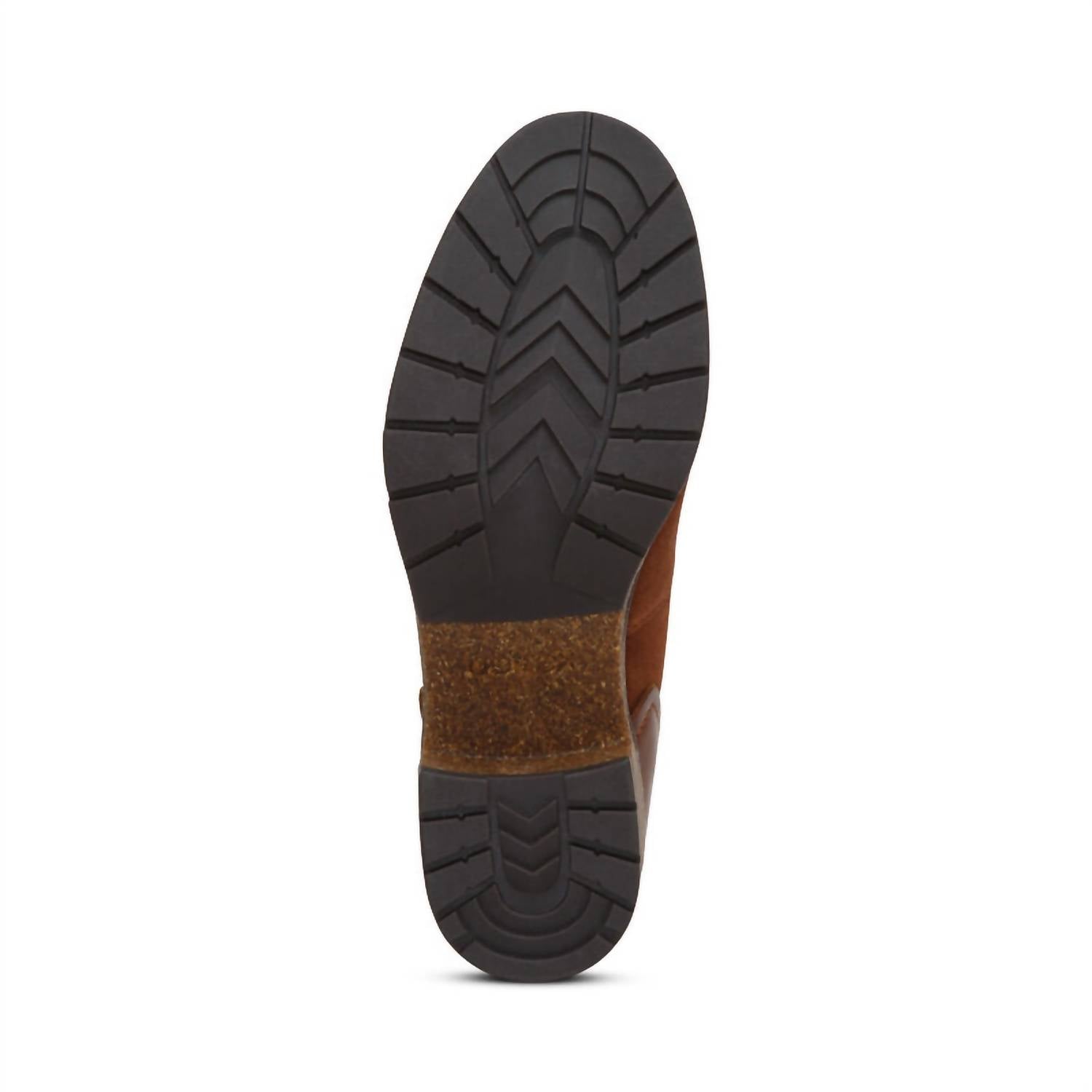 Dual side ankle stretchy gore material for easy on/off. Genuine leather upper. Lightweight rubber and cork outsole. Lug sole for added traction. Removable insole. Heel Height: 2". Calf Height: 5.5". Calf Circumference: 10.6".