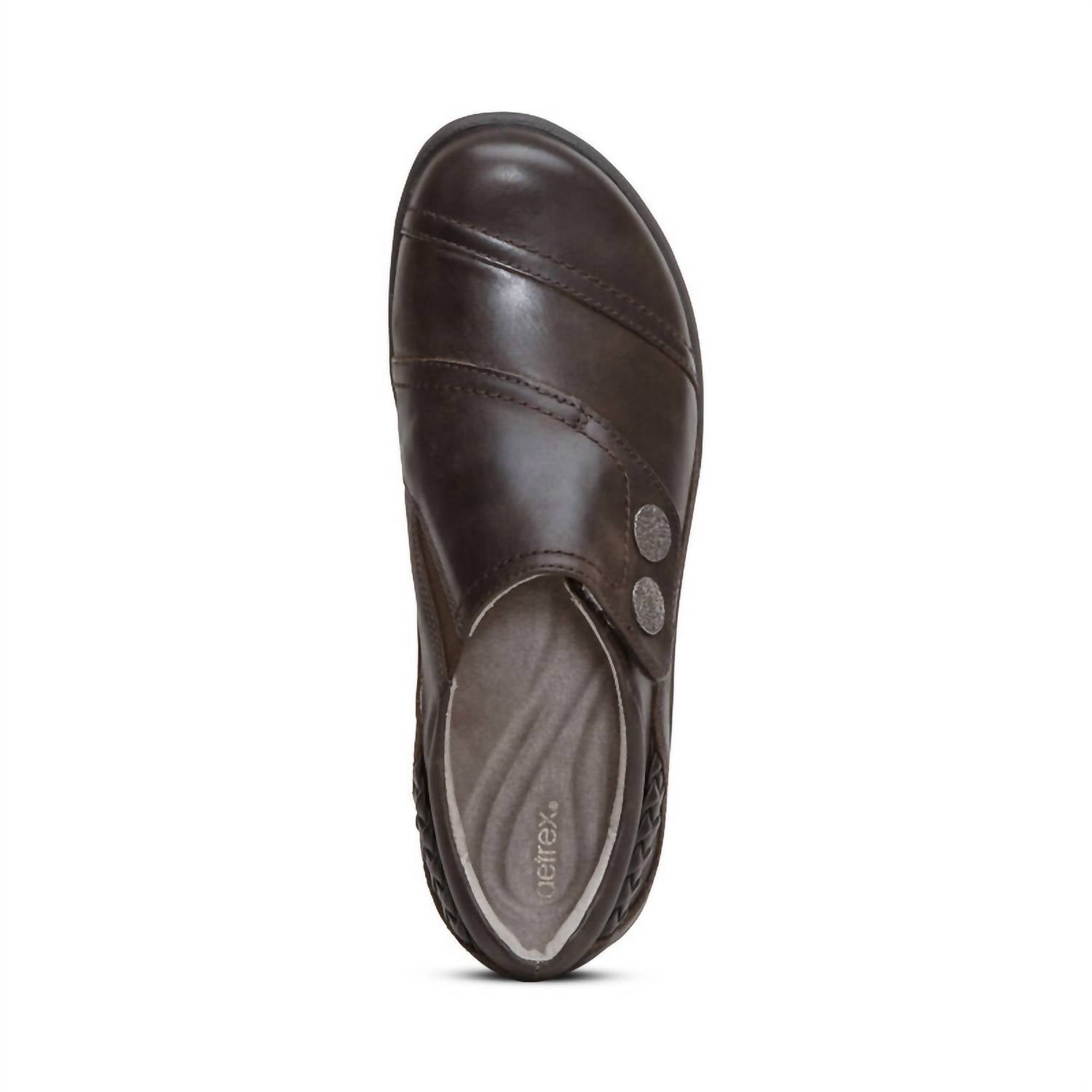 Step into comfort with the Aetrex Women's Karina Monk Shoes in a sophisticated IRON DM507 shade. These slippers, crafted from premium leather, feature a round toe design that exudes timeless elegance. Made for women, these shoes offer a medium width fit with a low heel height ranging from 1 1/4" to 2", providing both style and stability. Perfect for adults seeking a blend of comfort and chic style.