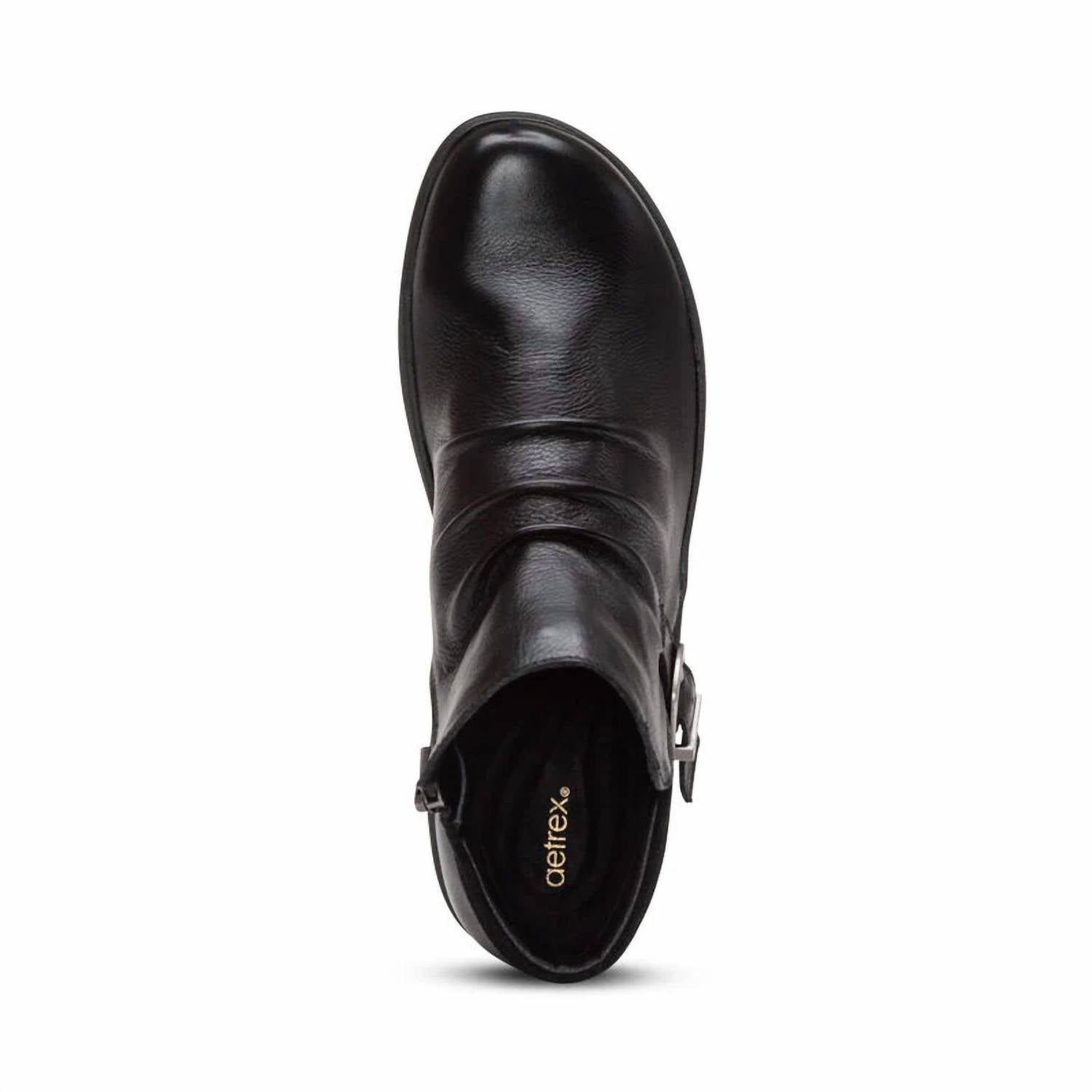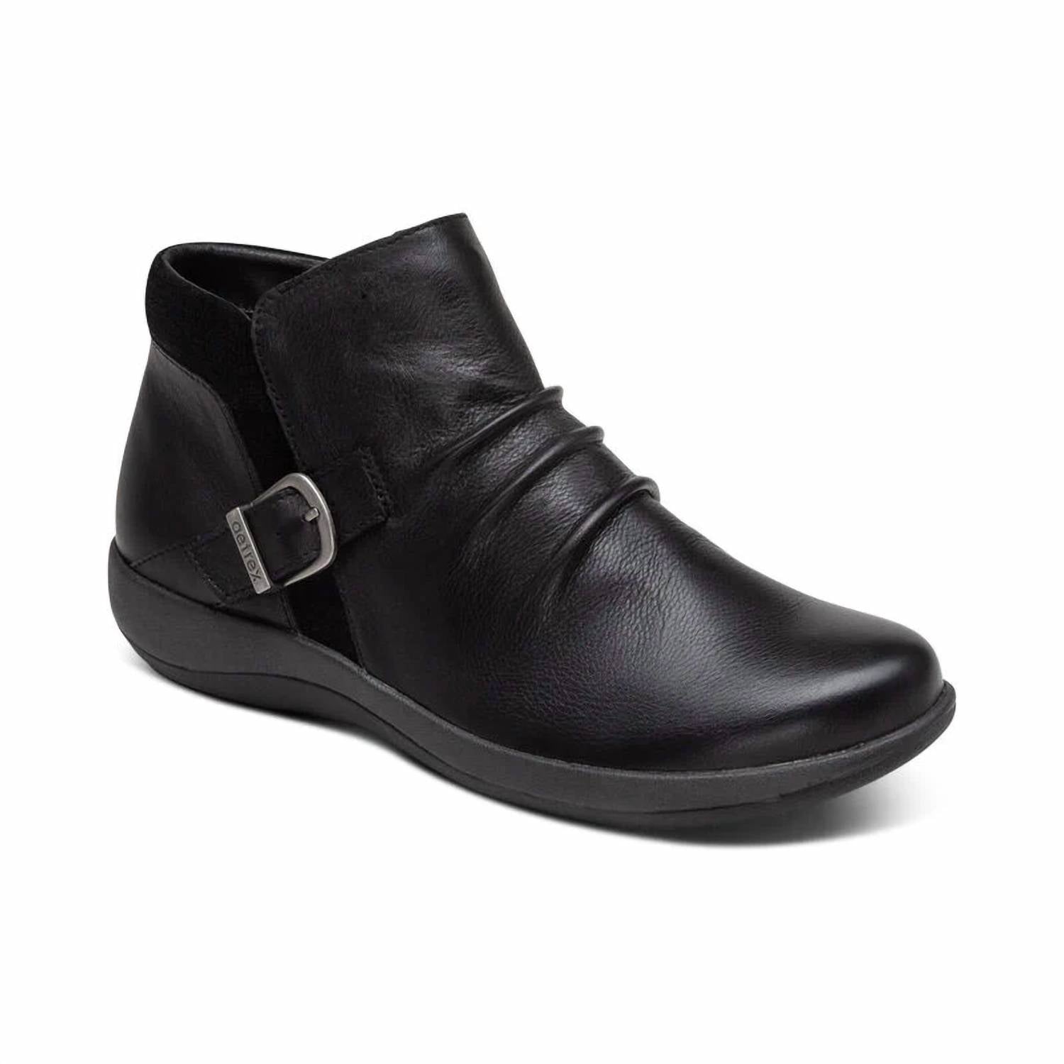 Say hello to the perfect, most versatile boot. The ankle height makes this style easily transition from day to night. Wear them with your favorite skinny jeans and tee for a more laid back look, or pair them with your favorite mini dress and jacket for a night out on the town. Discover the Women's Luna Buckle Boot by Aetrex, a stylish ankle bootie crafted from genuine leather and nubuck, perfect for your next concert. Designed with a round toe and a low flat heel of 1 5/16 inches, it offers both style and comfort. The boot features a side zipper closure and an adjustable buckle for a tailored fit, complemented by a lightweight EVA midsole and rubber outsole for effortless wear. Available in chic black, this boot includes a removable insole for customizable comfort.