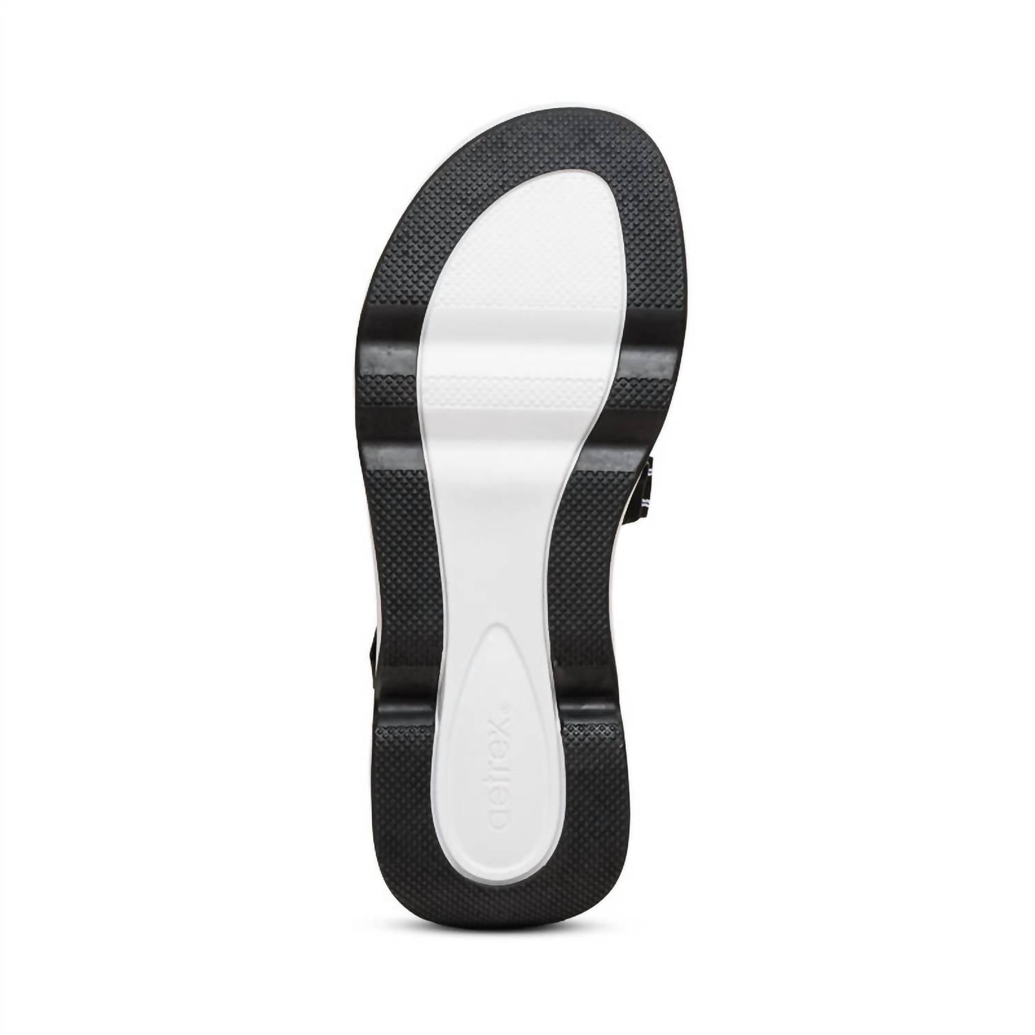 This sandal will take you from brunch to dinner and everything in between. Step out in comfort and style with the Aetrex Women's Marz Sandal, perfect for streetwear aficionados. Designed with breathable faux leather straps treated with antimicrobial technology, these sandals ensure freshness with every step. Featuring easy-to-use hook and loop closures and a supportive arch, they sit atop a durable rubber outsole with a lightweight UltraSky™ midsole for unmatched comfort. With a low 1.85" wedge heel and a padded heel and collar, they're water-friendly and perfect for various terrains, making them a go-to choice for all-day wear.