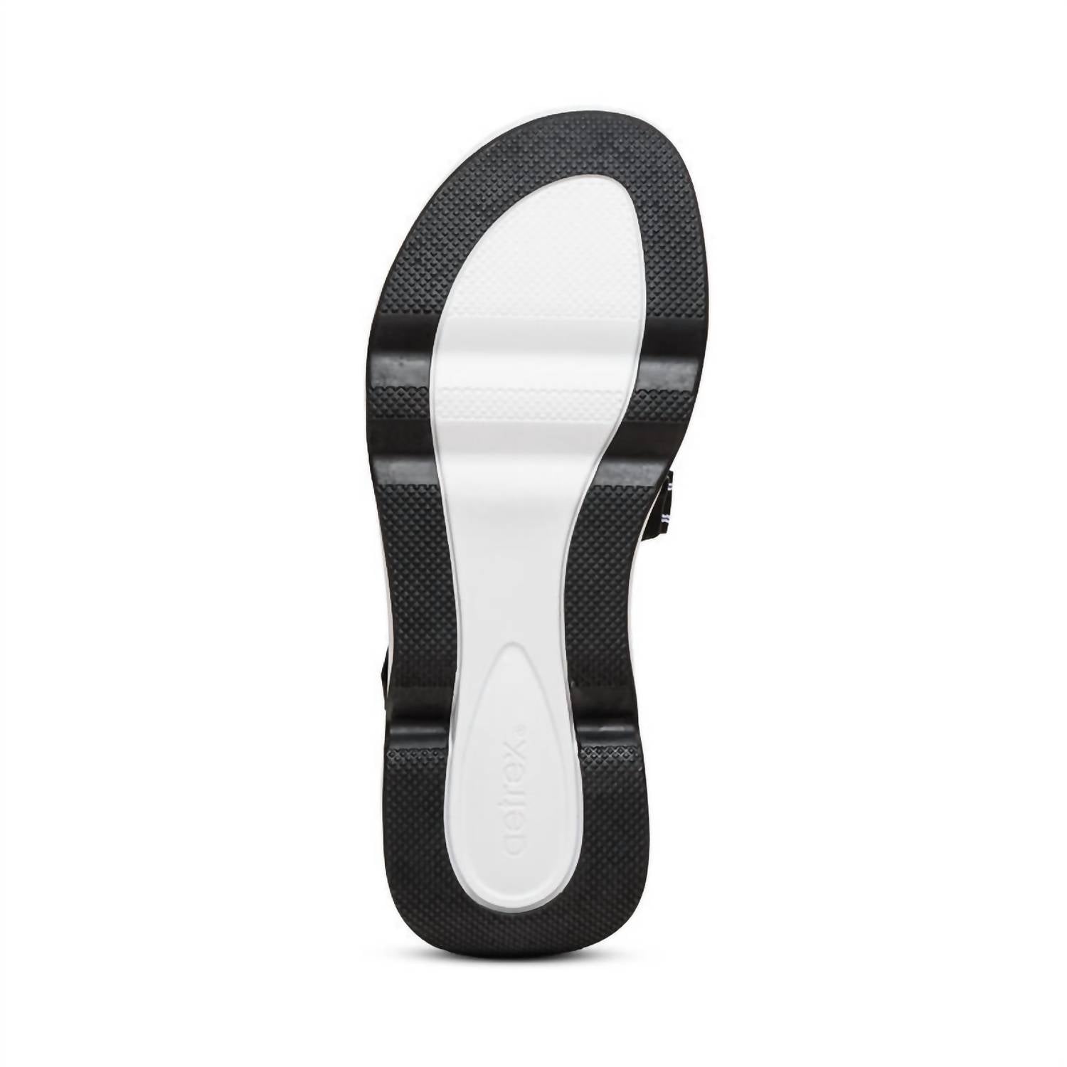 Experience ultimate comfort and style with the Women's Marz Sport Sandal by Aetrex, designed for the modern woman on the go. Crafted from faux leather treated with antimicrobial technology, these sandals effectively fight everyday odors while offering a water-friendly design. Enjoy the lightweight UltraSKY™ midsole for unparalleled comfort and a durable rubber outsole for lasting wear. Featuring lightweight webbing hook and loop closures for adjustability and a 1.85" heel height, these open-toe sandals are completed with a padded collar for extra cushioning. Perfectly presented in a chic black/white color.