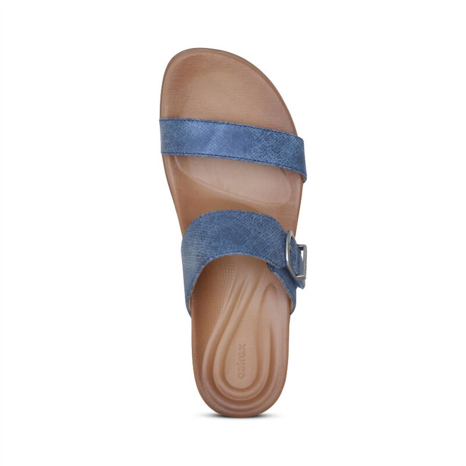 These slip-on sandals with arch support feature pressure relief technology throughout the footbed, adjustable straps, and a water-friendly construction, making them perfect for the beach or the pool. Upper material: faux leather treated with antimicrobial technology to help fight everyday odors. Midsole material: lightweight Ultrasky™ for comfort. Outsole material: rubber for durability. Removable insole: none. Heel height: 1.2".