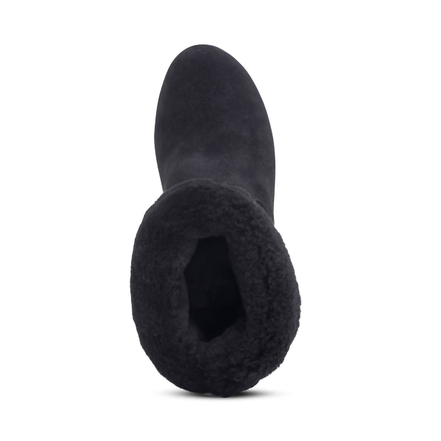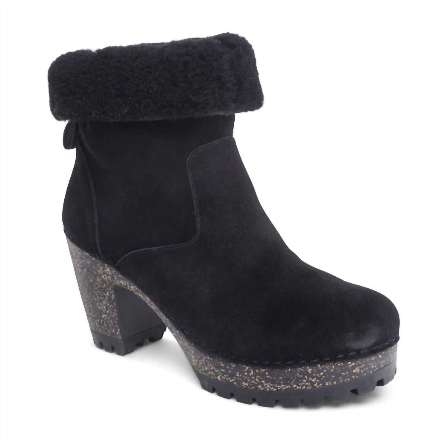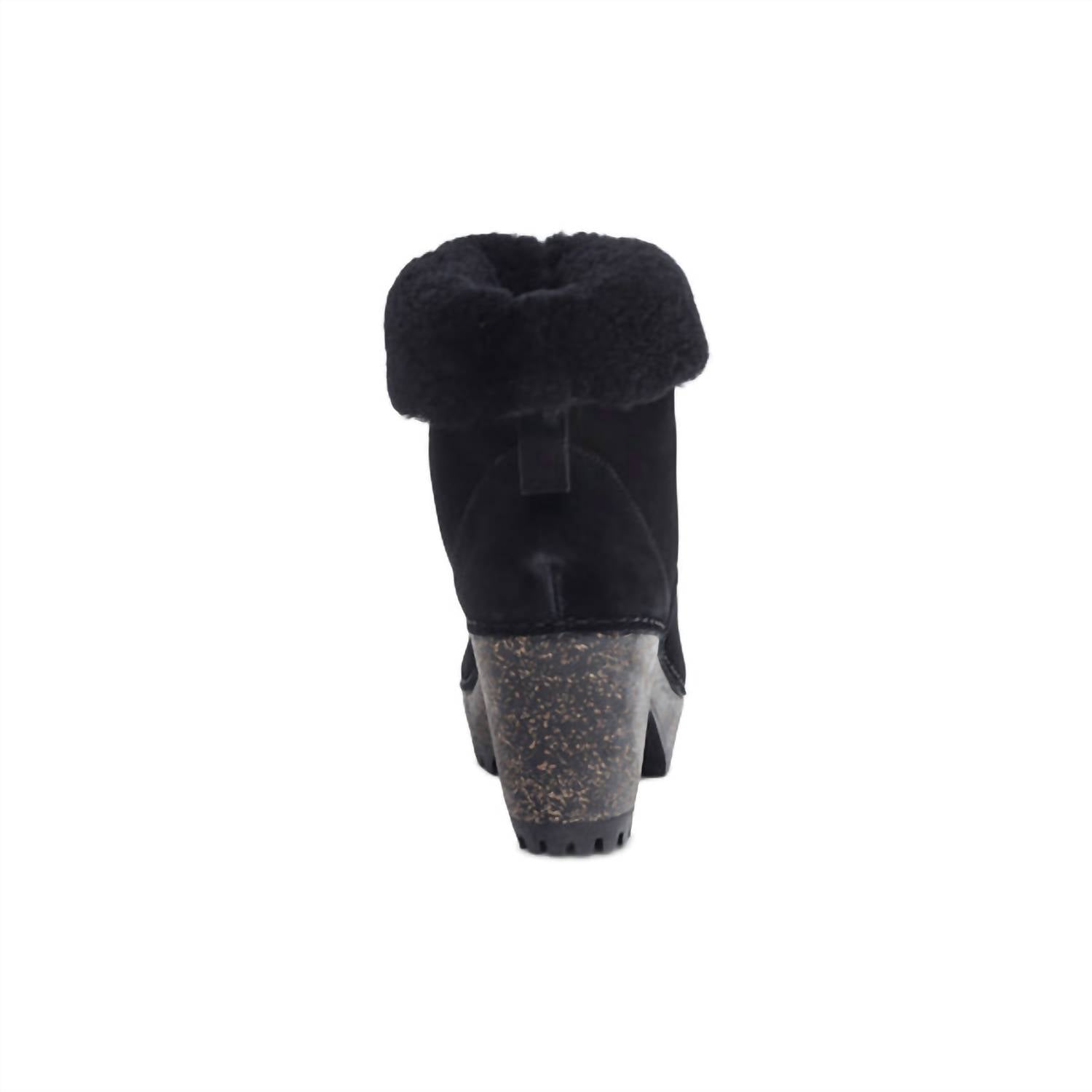 These heeled boots showcase a weather-friendly genuine suede upper with a cozy shearling lining, complemented by an ultra-light cork midsole. The rubber outsole, complete with a lug sole, ensures added traction and durability, while the 3.25" heel height adds an elegant lift. Designed with pull tabs for easy on and off, these boots are treated to protect against rain and puddles.