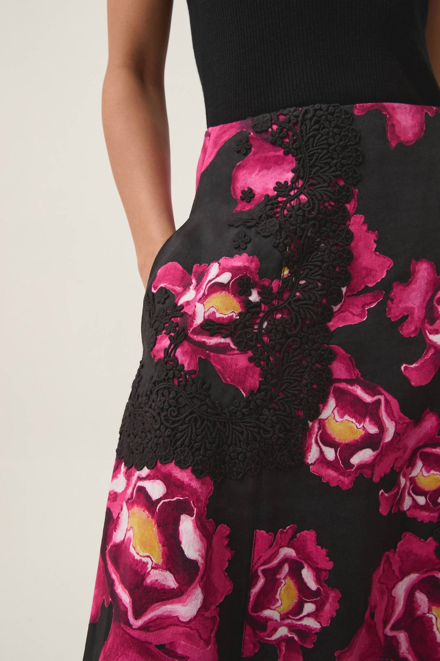 Show off just the right amount of skin in this beautifuly designed midi length skirt. Introducing the Florence Midi Skirt by Aje., a stunning addition to any wardrobe in a captivating Midnight Peony hue. This women's midi skirt offers a voluminous fit with convenient side pockets and is beautifully accented with a lace trim. Crafted from a premium linen blend composed of 69% linen and 31% viscose, it features a zip with hook and eye closure. This lined skirt effortlessly combines elegance and functionality with its floral pattern and practical closure.