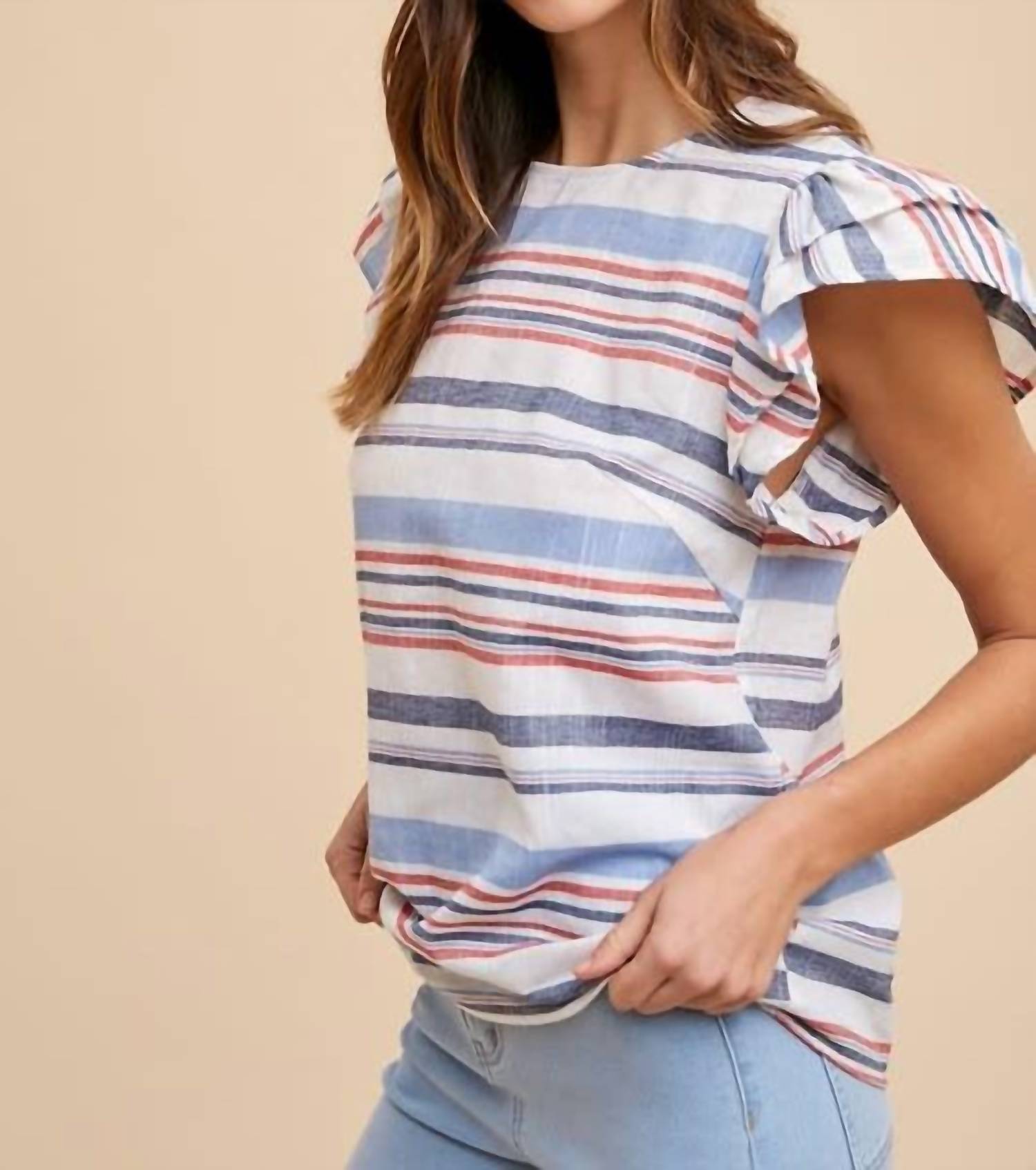 Introducing the Stripe Ruffle Sleeve Top by AnnieWear, a standout piece designed in vibrant red, white, and blue stripes. This blouse features double-layered ruffle cap sleeves and a flattering crewneck for a relaxed fit. The back keyhole with button closure adds a charming touch to this eye-catching top. Made for effortless styling, this piece is an ideal addition to any wardrobe.