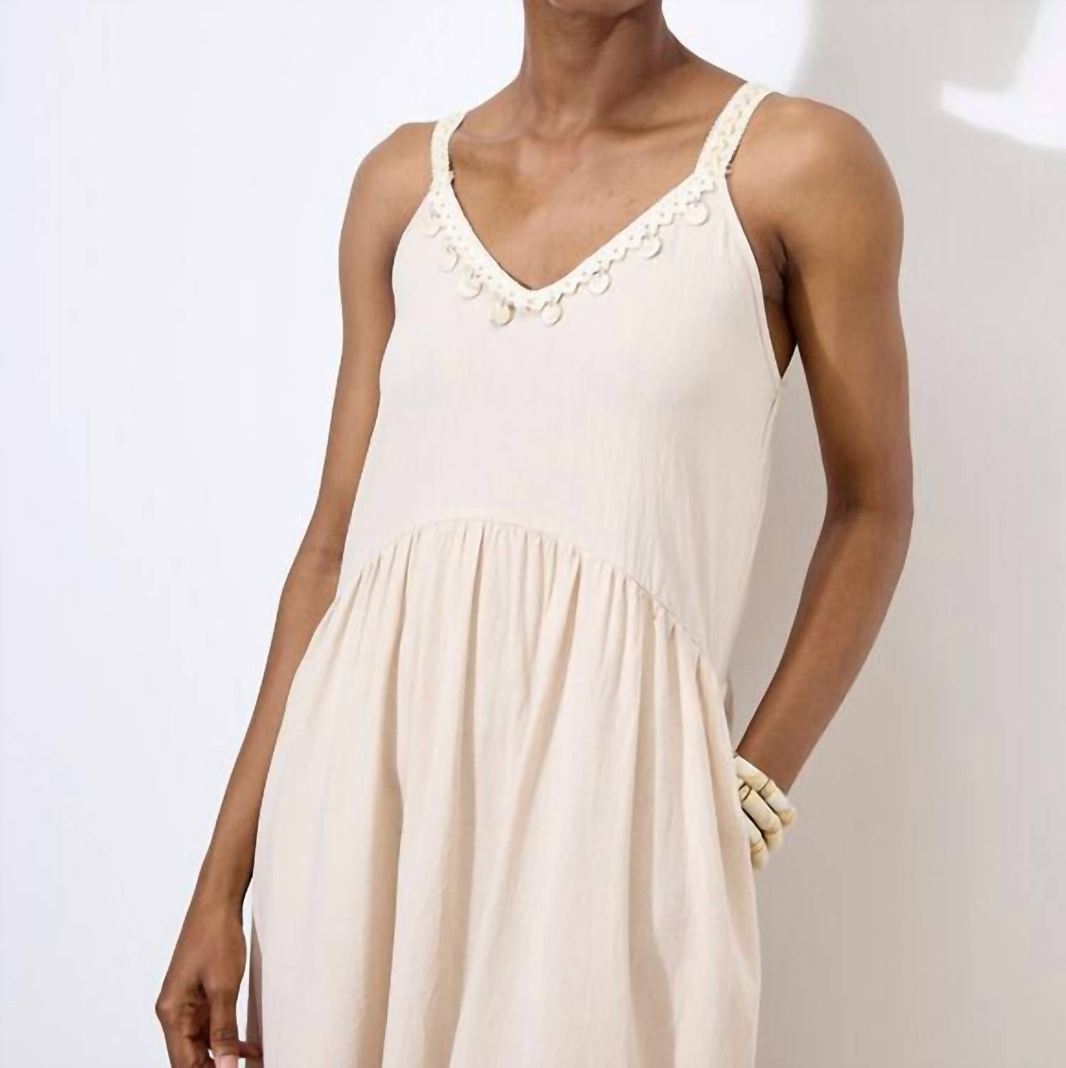 Just add slides or mules and you are good to go. Embrace boho chic in the Natural Tiered Midi-Dress by Apricot, an enchanting piece ideal for your summer getaways. Crafted from 100% cotton, this stone-tone sleeveless dress has a flattering 53.14-inch midaxi length and a distinctive V-neck embellished with beaded discs. Designed with pull-on closure for easy wear and featuring practical side seam pockets, it's perfect for effortless vacation style. Care: Machine wash. Model is wearing XS/UK 8 and is 5'9" tall.