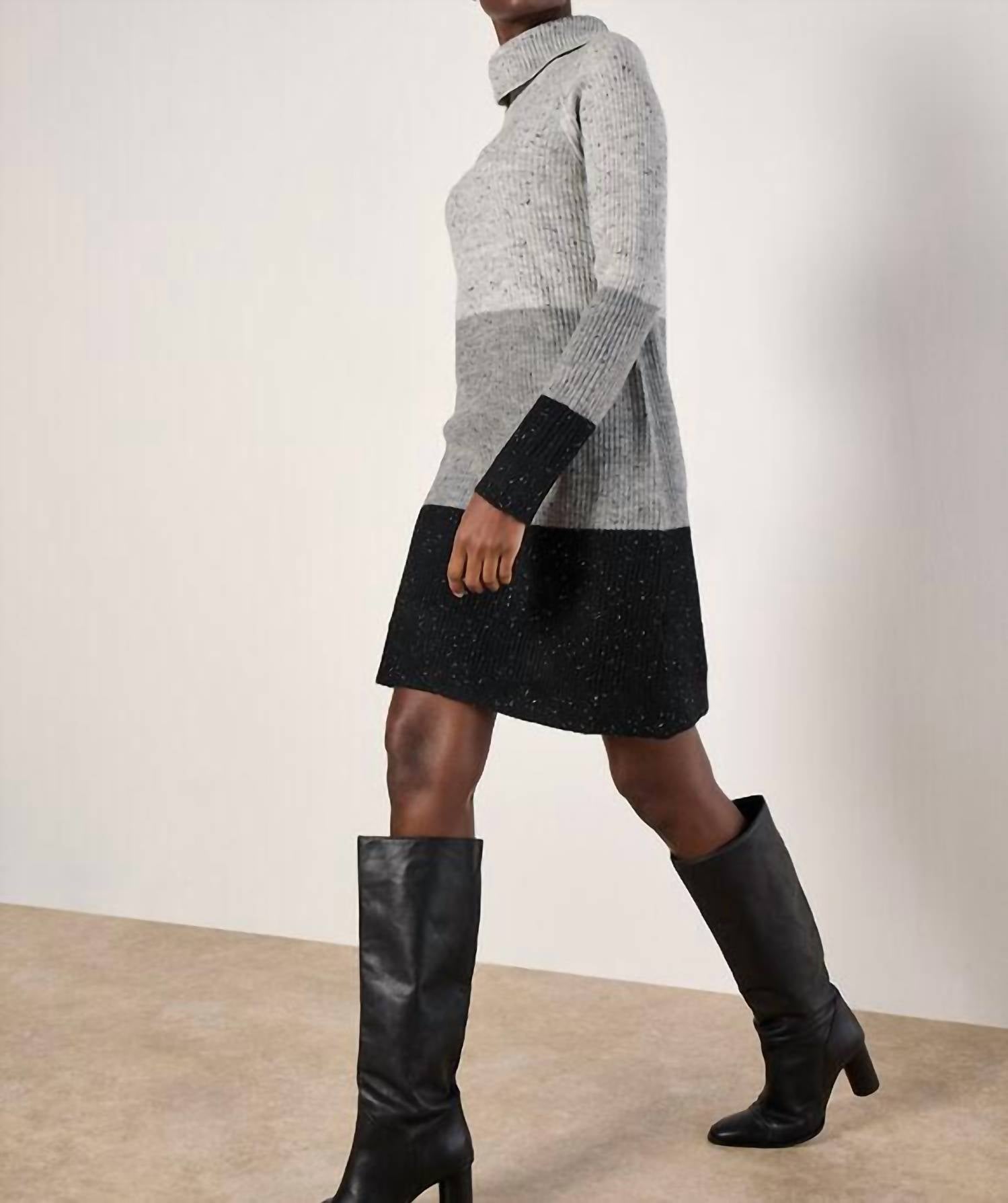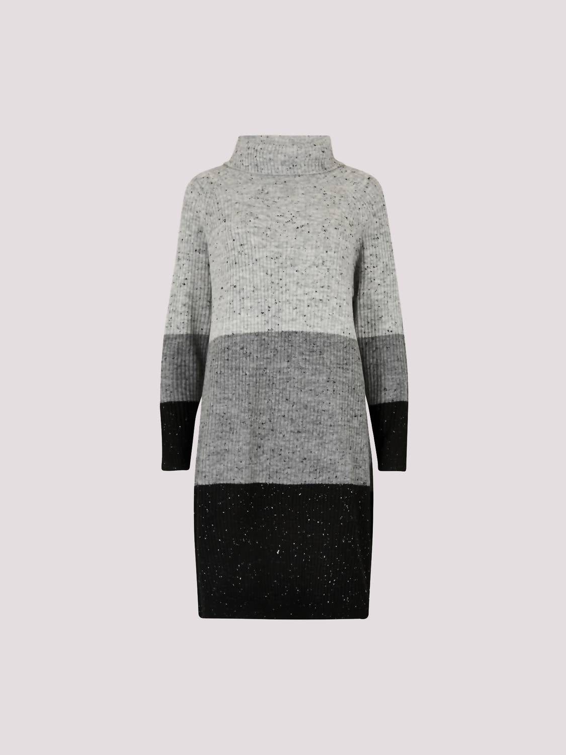 This mid-weight, ribbed knit jumper dress features a bold color block design with flecked yarn and a cosy roll neck. It has long sleeves and is a pullover style. Fabric Composition: Fabric 1: 72% polyester, 24% acrylic, 4% elastane; Fabric 2: 63% acrylic, 34% polyester, 3% elastane. Approx. 37" in length. Machine wash, dry flat.