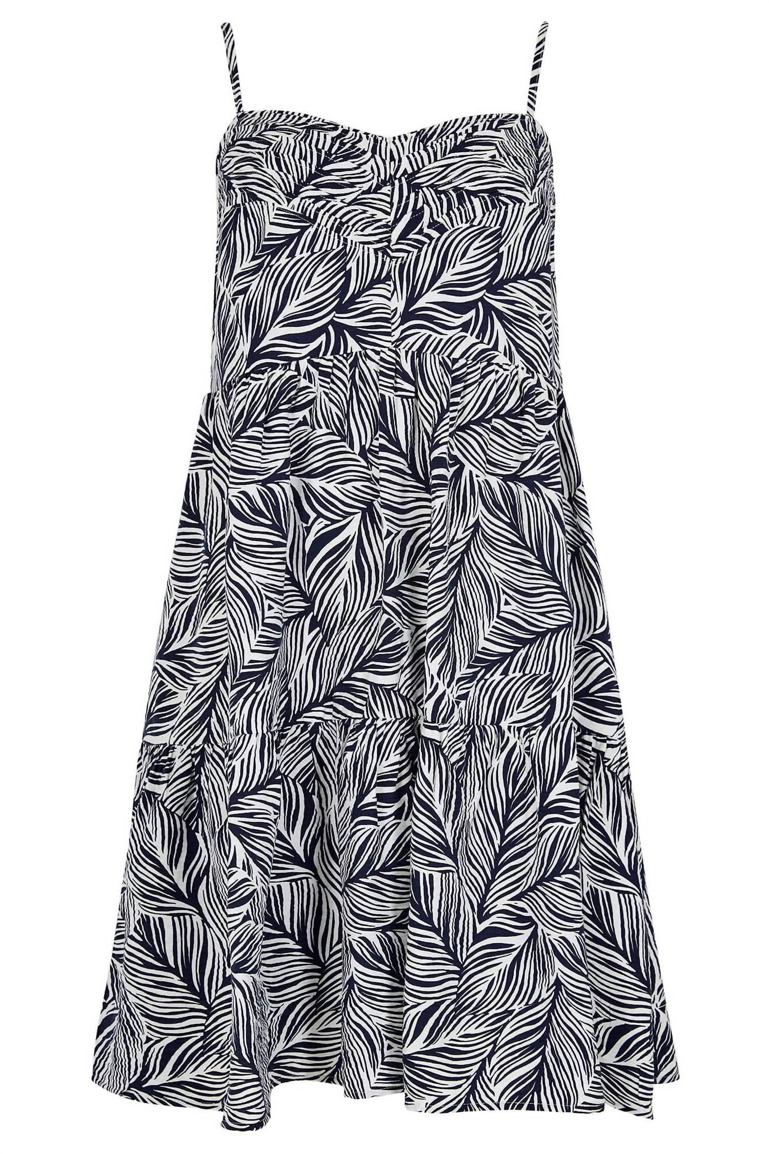 The kind of easy and flattering dress you'll be reaching for all season long.This mini dress features a geometric leaf print on a 91% Viscose, 9% Nylon blend. The pintuck bodice highlights an A-line silhouette, complemented by a scoop neckline and spaghetti straps. This pull-on style combines comfort and sophistication, suitable for both casual and formal occasions.