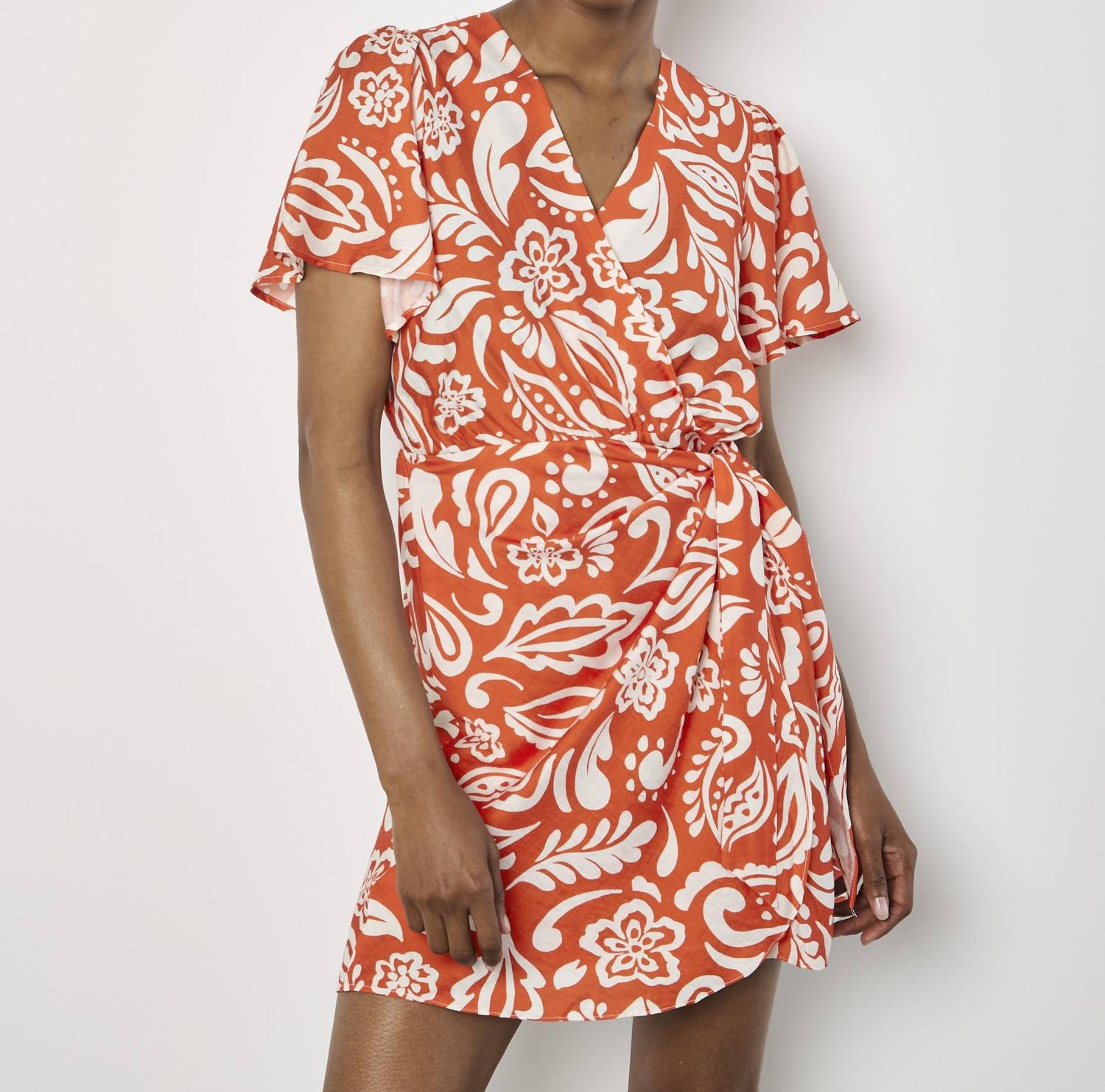 A short and breezy dress for those warmer days. Elevate your office style with the Kathryn Work Dress by APRICOT, featuring short sleeves in a vibrant orange hue. Crafted from a blend of 75% cotton and 25% linen, this mini-length dress sports a chic wrap front with a V-neckline. Made under fair working conditions in Vietnam, it closes with a tie closure for an adjustable fit. Care: Machine wash.
