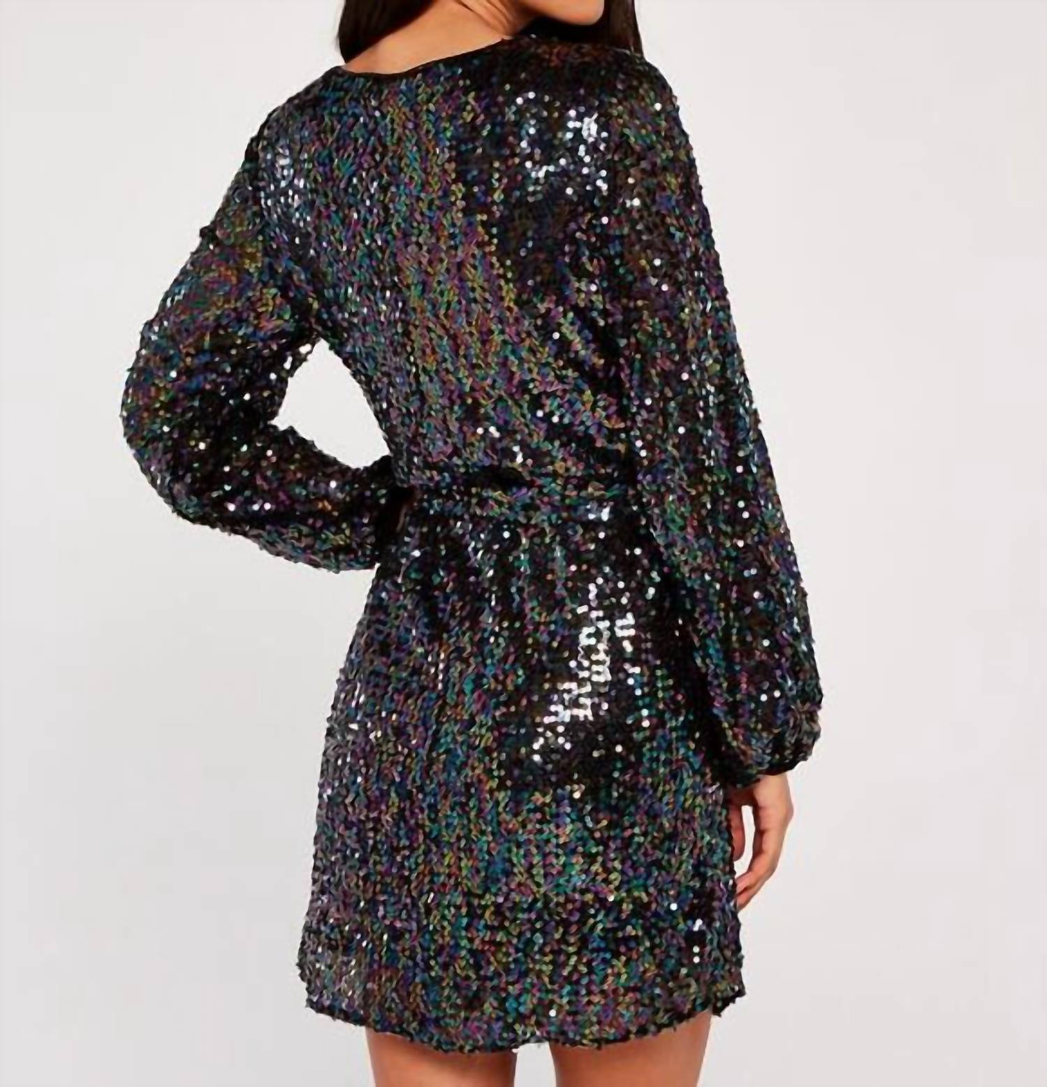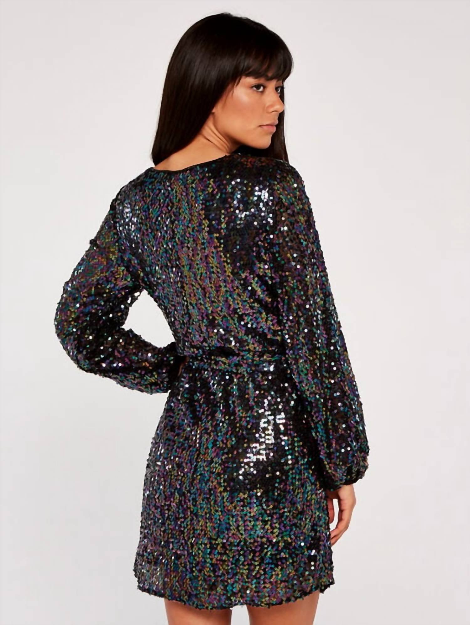 The kind of easy and flattering dress you'll be reaching for all season long. Shimmer in style with this black sequin-embellished mini dress. Designed in a chic shift silhouette, it features a round neckline and a flattering tie waist for a customizable fit. The long balloon sleeves with elasticated cuffs add a touch of elegance, while the keyhole button fastening at the back completes the look. Perfect for a night out or special occasions. Main: 96% Polyester, 4% Elastane. Lining: 100% Polyester.