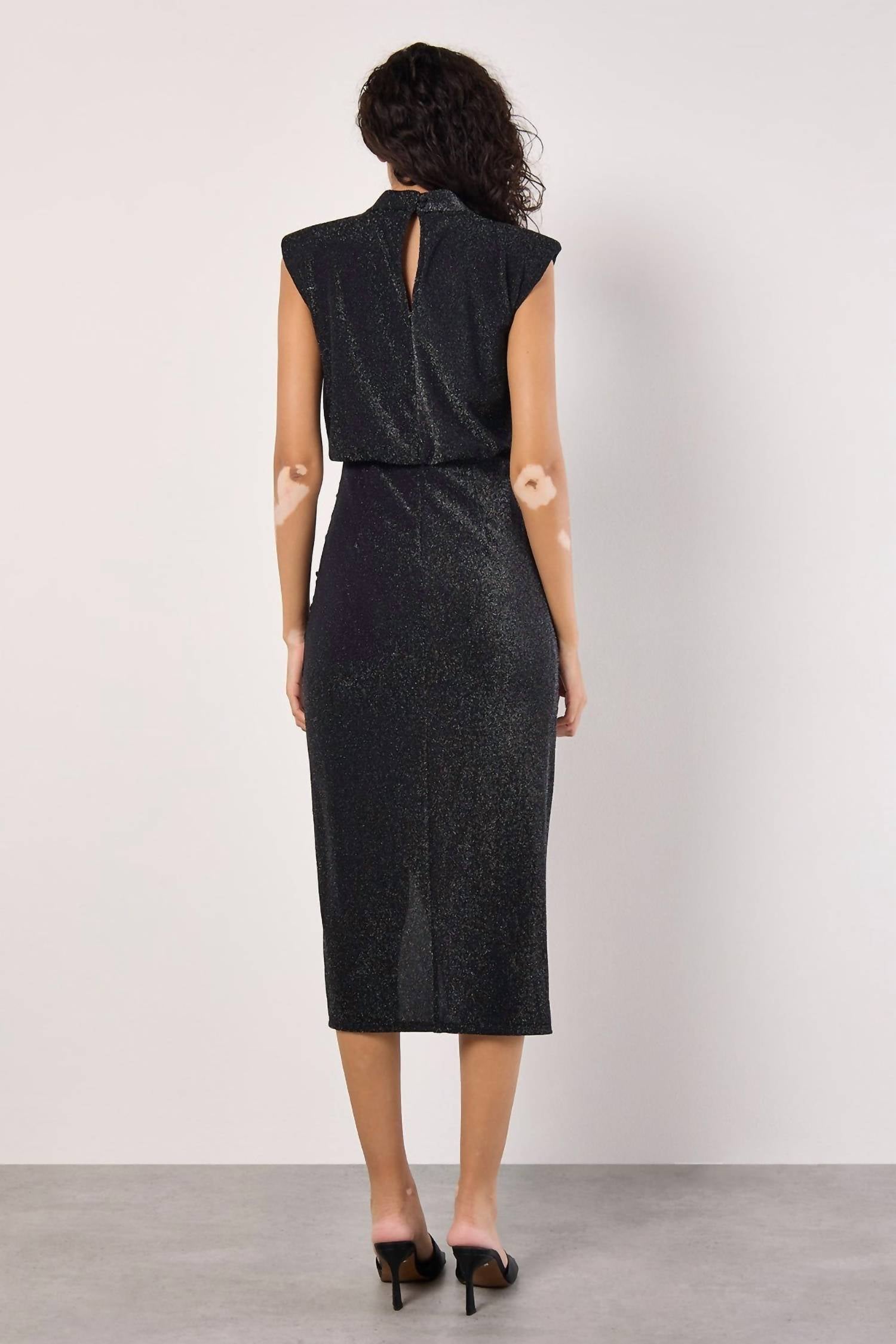 A midi dress so versatile, your options for wearing it are endless. Elevate your evening look with the Sparkle Mock Neck Ruched Dress by APRICOT, crafted in a luxurious black nylon blend featuring a textured pattern. This sleeveless sheath silhouette dress is accentuated with added shoulder pads and a sophisticated mock neck. The shell is composed of 77% Nylon, 18% Metallised Fibre, and 5% Elastane, while the lining is made from 100% Polyester. Closure is discreetly ensured with a button design.