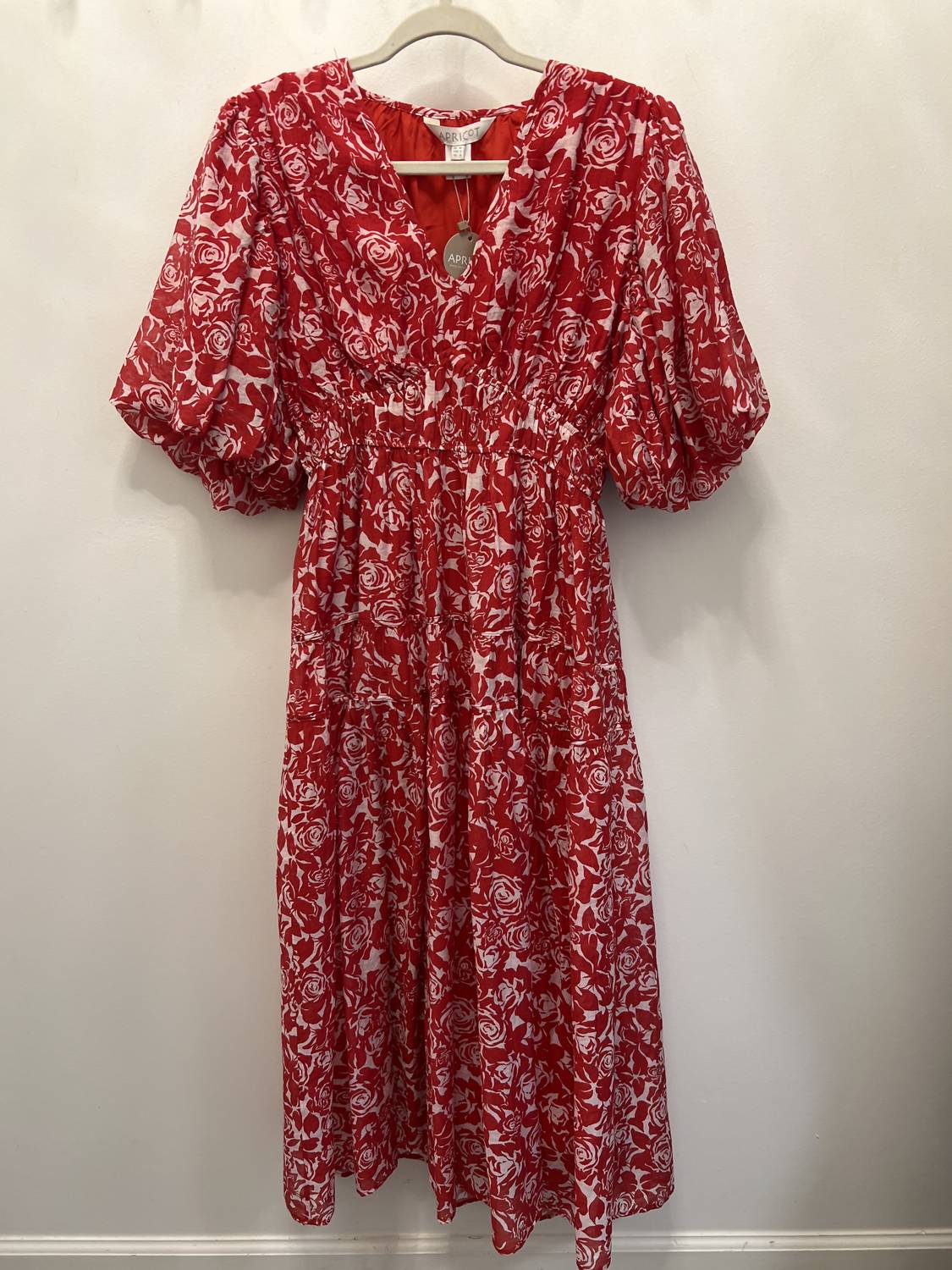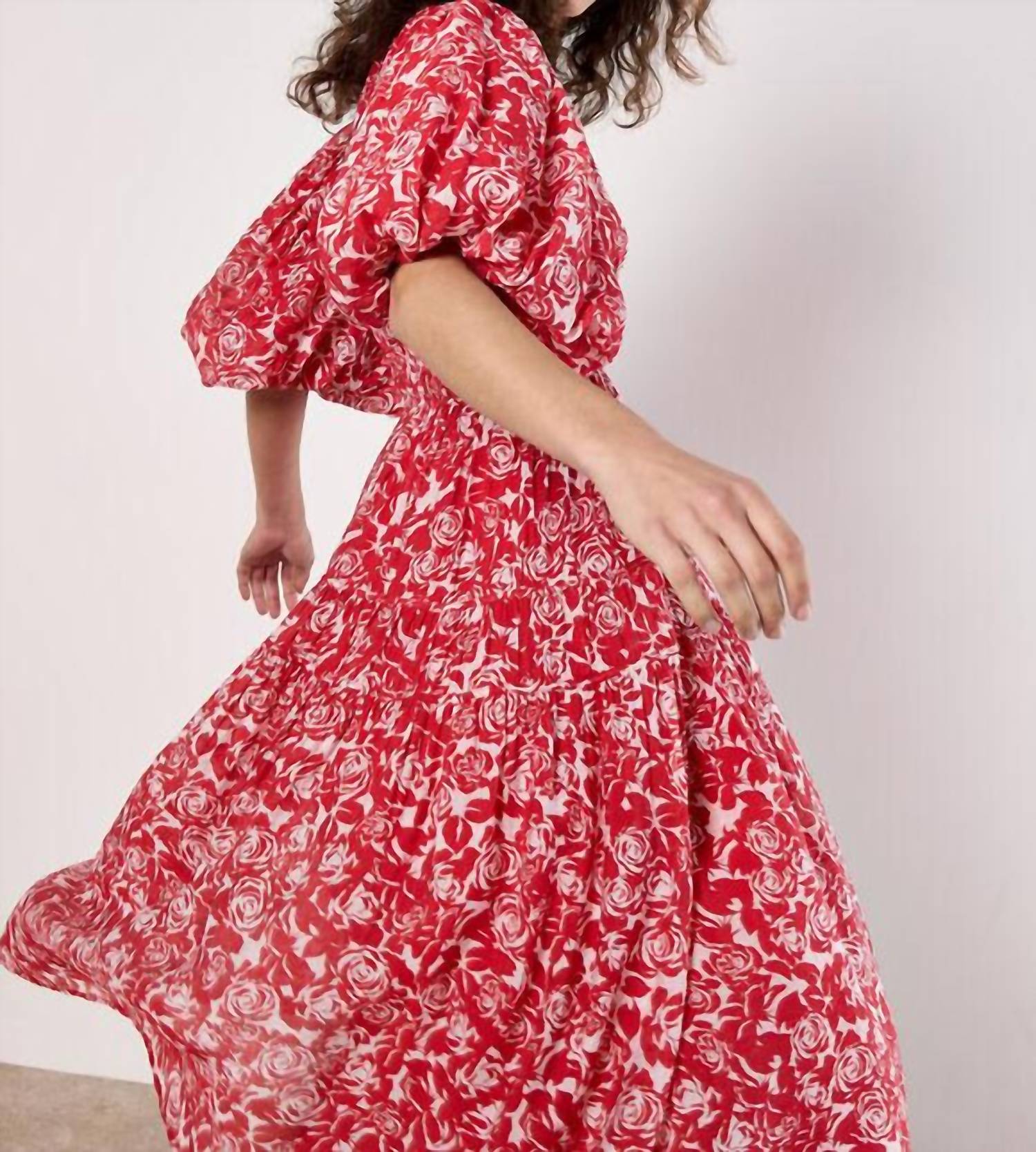 The Tiered Roses Midi Dress by APRICOT is a stunning choice for any spring occasion. With its short sleeves and A-line silhouette, this red floral dress ensures a flattering fit. Crafted from a Viscose Blend, it features a charming V-neck that enhances its feminine appeal. Care is simple with a hand wash recommended to maintain its beauty.