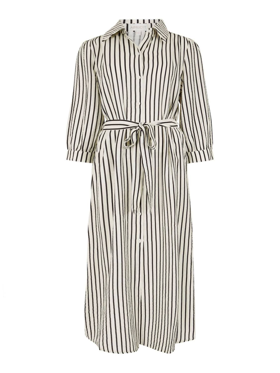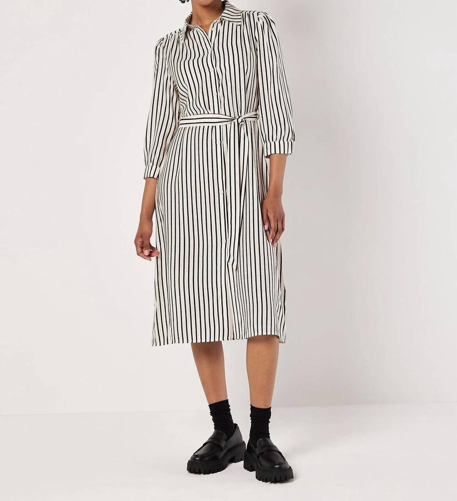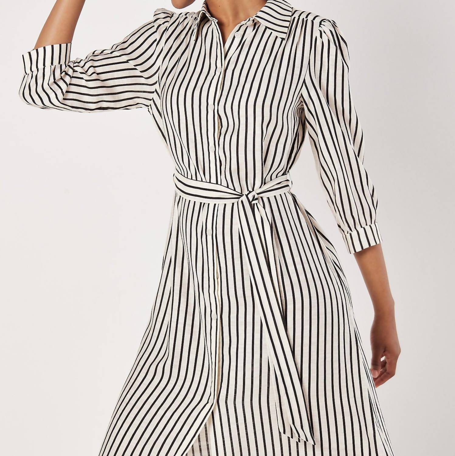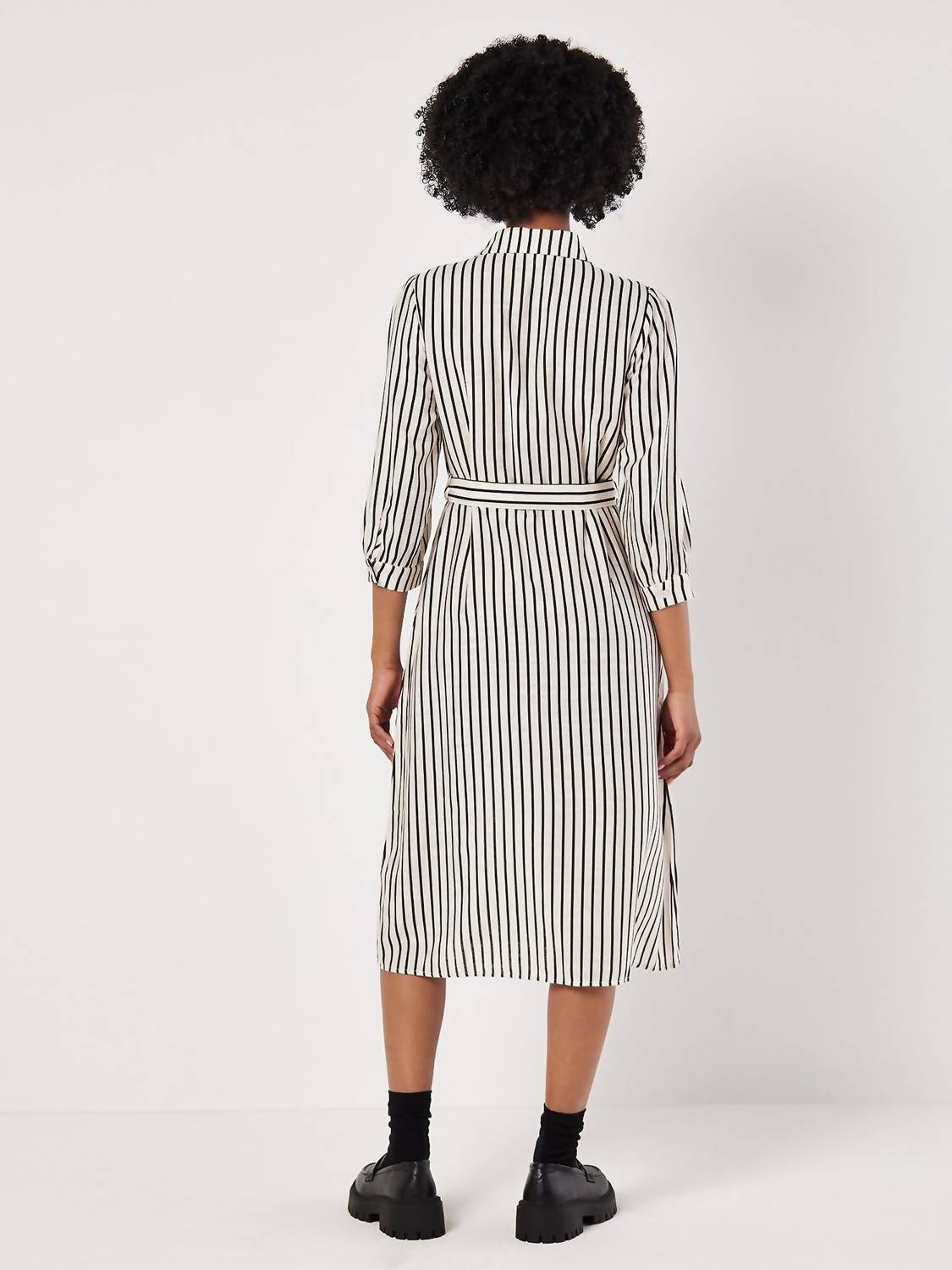 The perfect length dress does exist. Elevate your wardrobe with the Vertical Stripe Gathered Sleeve Midi Dress by APRICOT, featuring a sophisticated stone/black stripe pattern. This dress showcases three-quarter sleeves, composed of a viscose blend, and a stylish midi length measuring approximately 112cm (44.09 inches). Made for the modern woman, it boasts a button closure, a collared neckline, and a fabric belt for a flattering silhouette. Care for this elegant piece is simple with machine wash instructions.