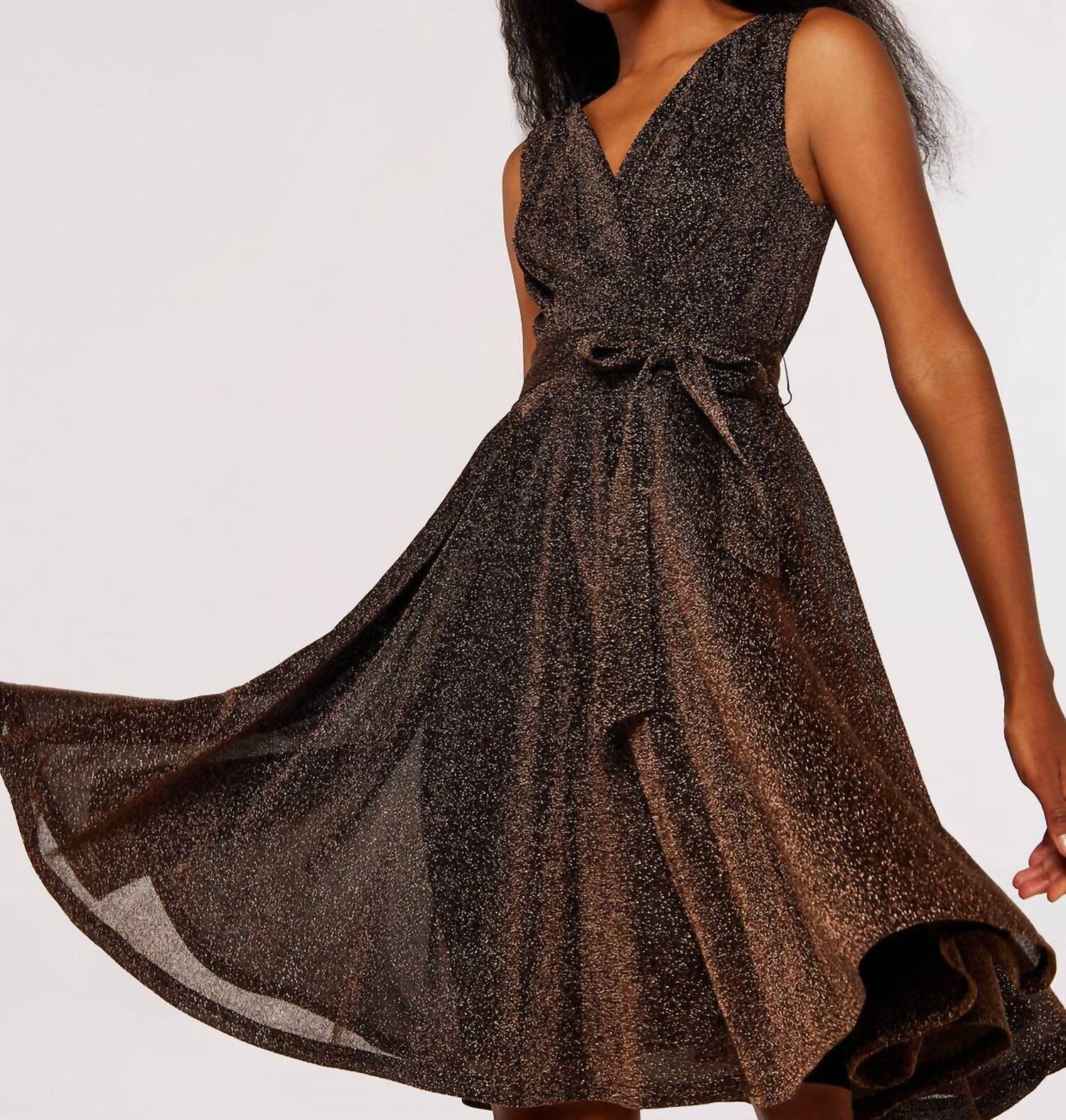 The kind of easy and flattering dress you'll be reaching for all season long. Get ready to shine in the Women's Lurex Fit & Flare Dress by APRICOT, perfect for any occasion with its sparkle pattern. This sleeveless dress features a cache coeur neckline and comes in a flattering fit and flare silhouette. Crafted from 100% polyester shell with a lining of 95% polyester and 5% elastane, this piece ensures comfort and style. Closure is conveniently provided by a zip, and care is simple with a 30-degree cold machine wash on a gentle wool cycle; iron cool and avoid tumble drying. The model is wearing a size S/UK 10, standing at 5' 7.5" tall.