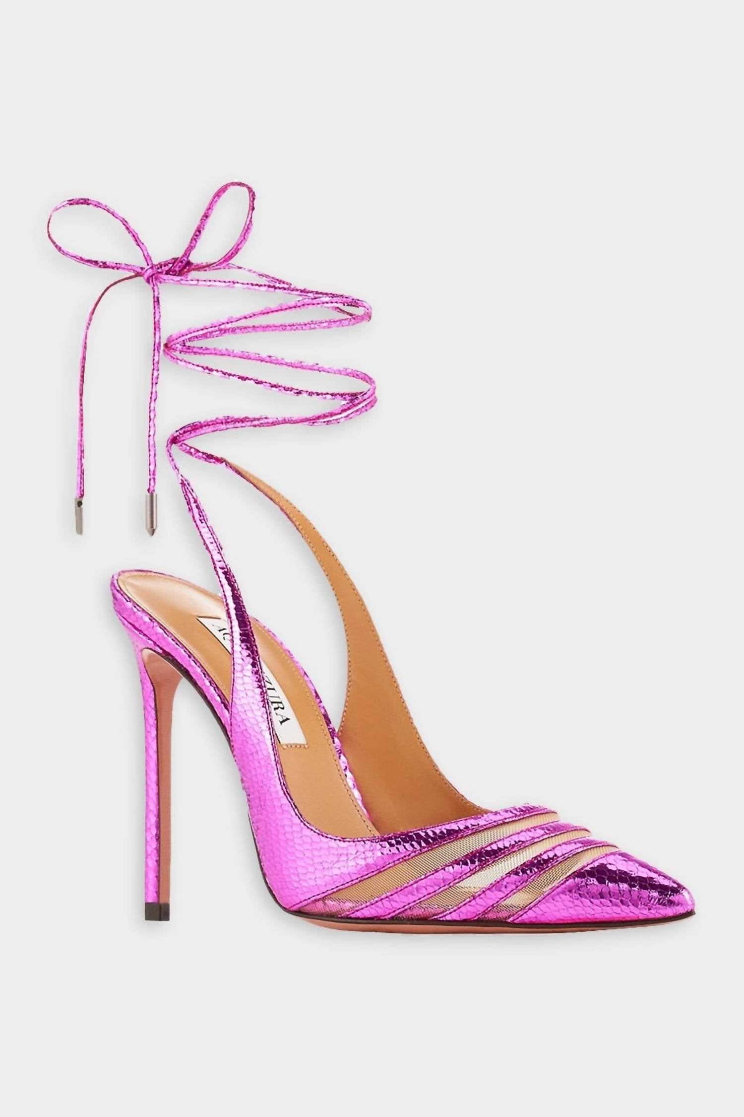 The perfect height for day to night. Step out in style with the Unfaithful Metallic Leather Ankle-tie Pumps 105 by Aquazzura, offering a striking fuchsia hue that captivates. Crafted in Italy, these pumps feature a glamorous stiletto heel towering at 4.13 inches for an elegant lift. The pointed toe design complements its sophisticated composition, with the upper made from 70% goat leather and 30% textile, lined with 100% goat leather, and a sole of 100% calf leather. This high-fashion choice channels Aquazzura's renowned craftsmanship, perfect for the fall season.