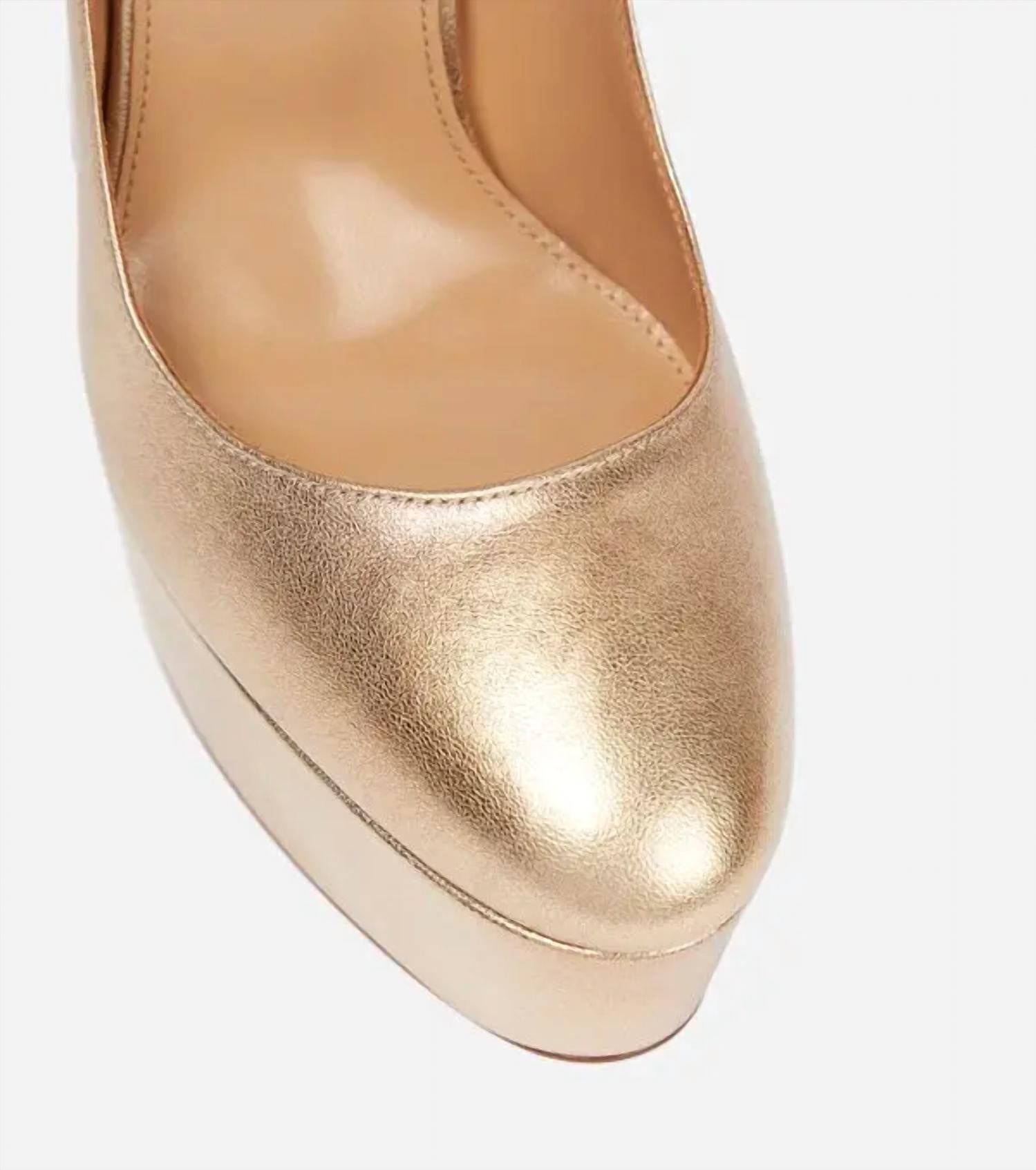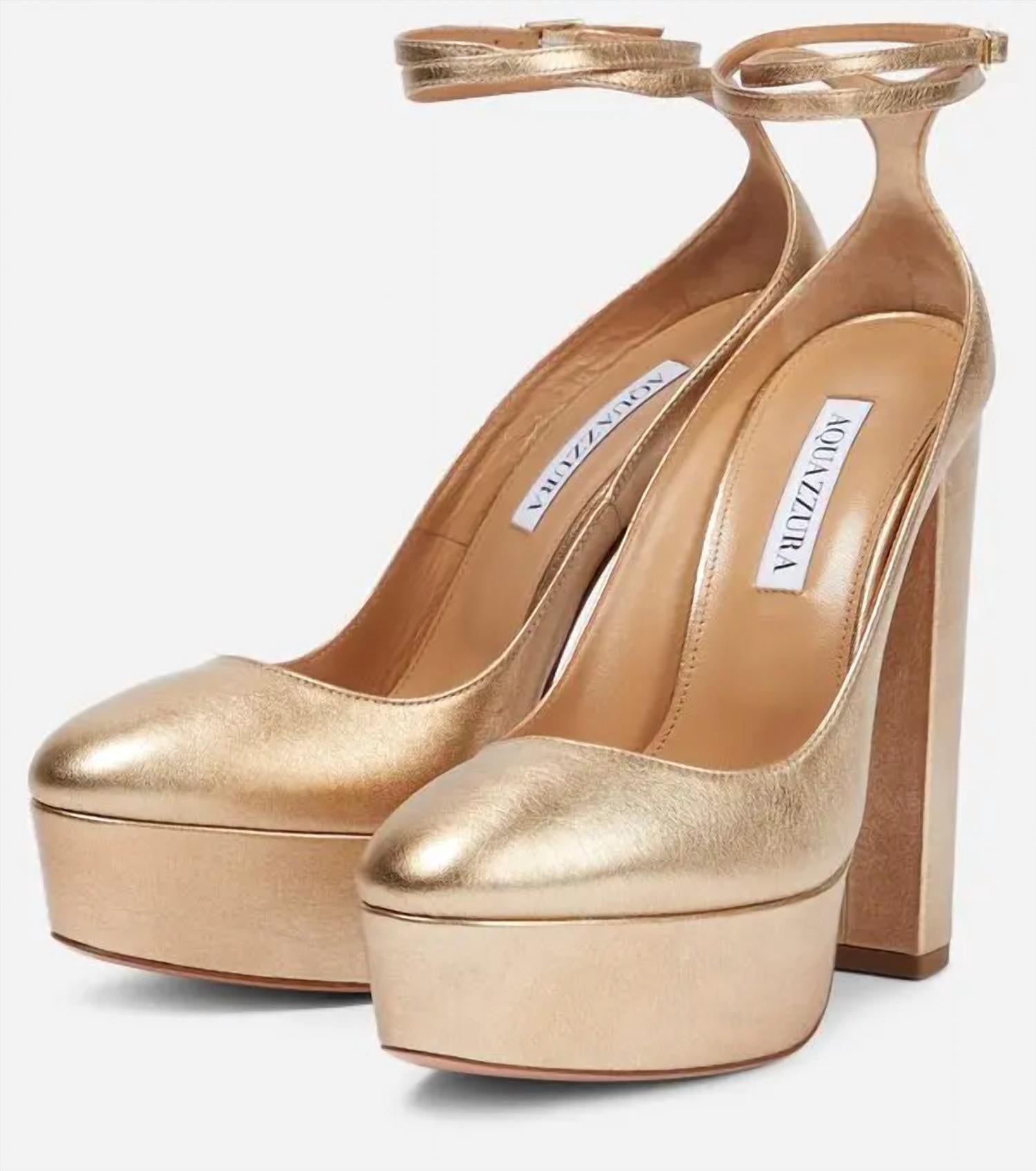 Don't be deceived, these heels are comfy as can be. Step into heightened elegance with the Women's Blake Plateau 140 Platform Heels by Aquazzura in a sophisticated soft bronze hue. Crafted meticulously with an upper of 100% lamb leather, lining of 100% goat leather, and a sole of 100% calf leather, these Italian-made heels ensure luxury from every angle. Designed with a round toe and a striking platform heel, they elevate your style with an impressive 5.51-inch lift. Embrace the sophistication and craftsmanship of these resort 2023 masterpieces, styled for the modern woman.