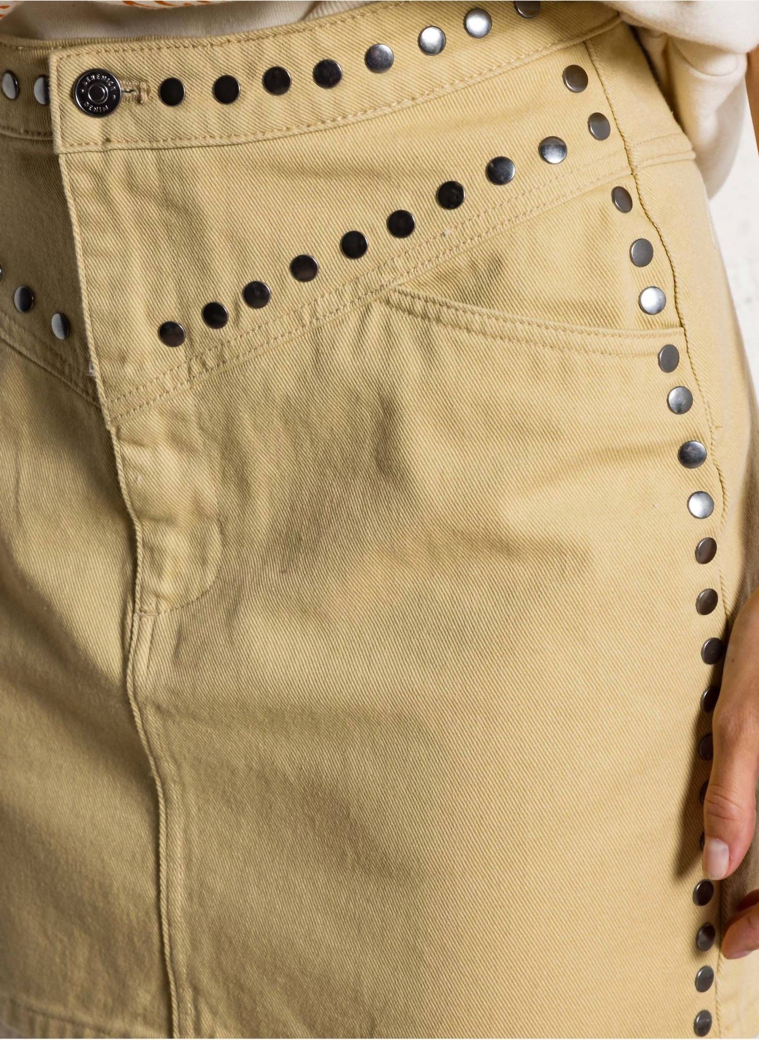 Elevate your concert look with the Jupe Dourte Studs Skirt by Berenice in a chic sand hue. Crafted from 100% cotton denim, this women's mini skirt features a length of 16 inches for size 36. It includes a practical button and zip closure accompanied by two side pockets and stylish stud details. Made in China, it's easy to care for with machine wash instructions.