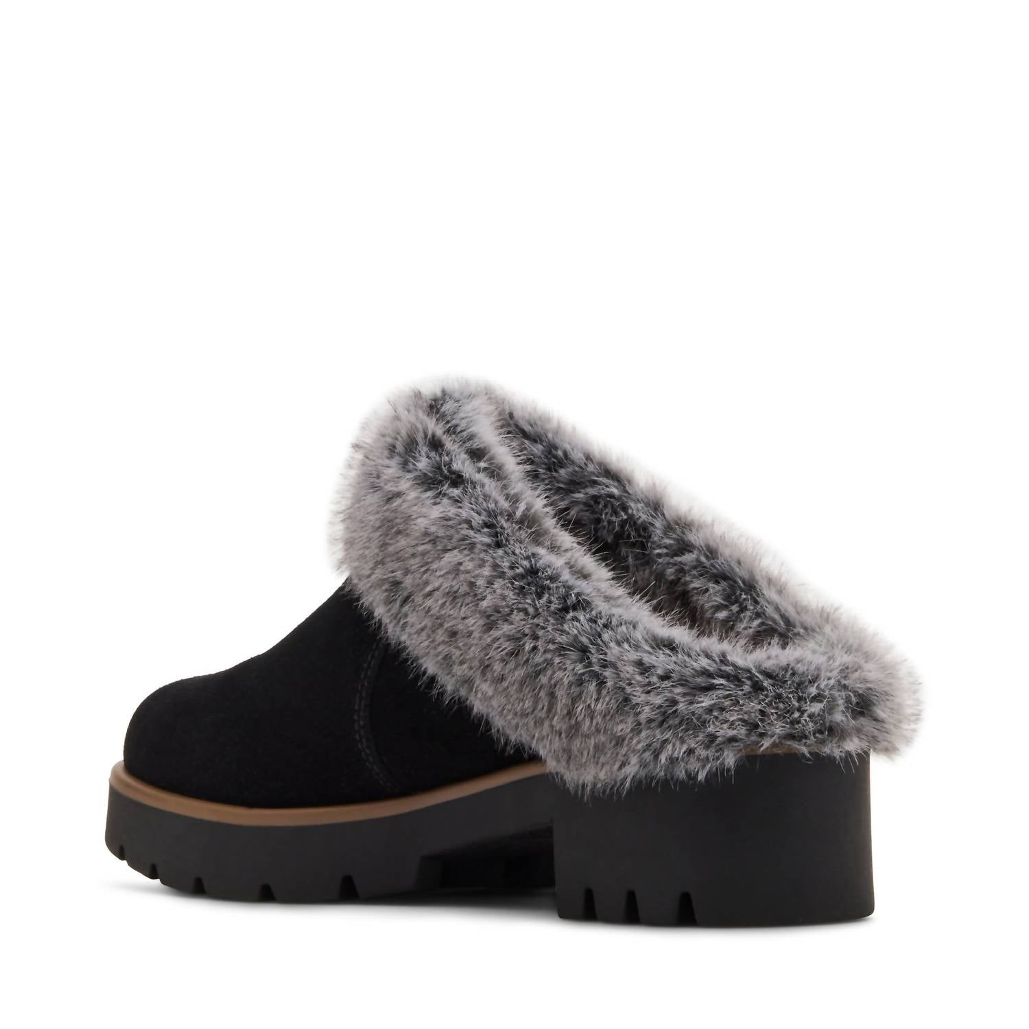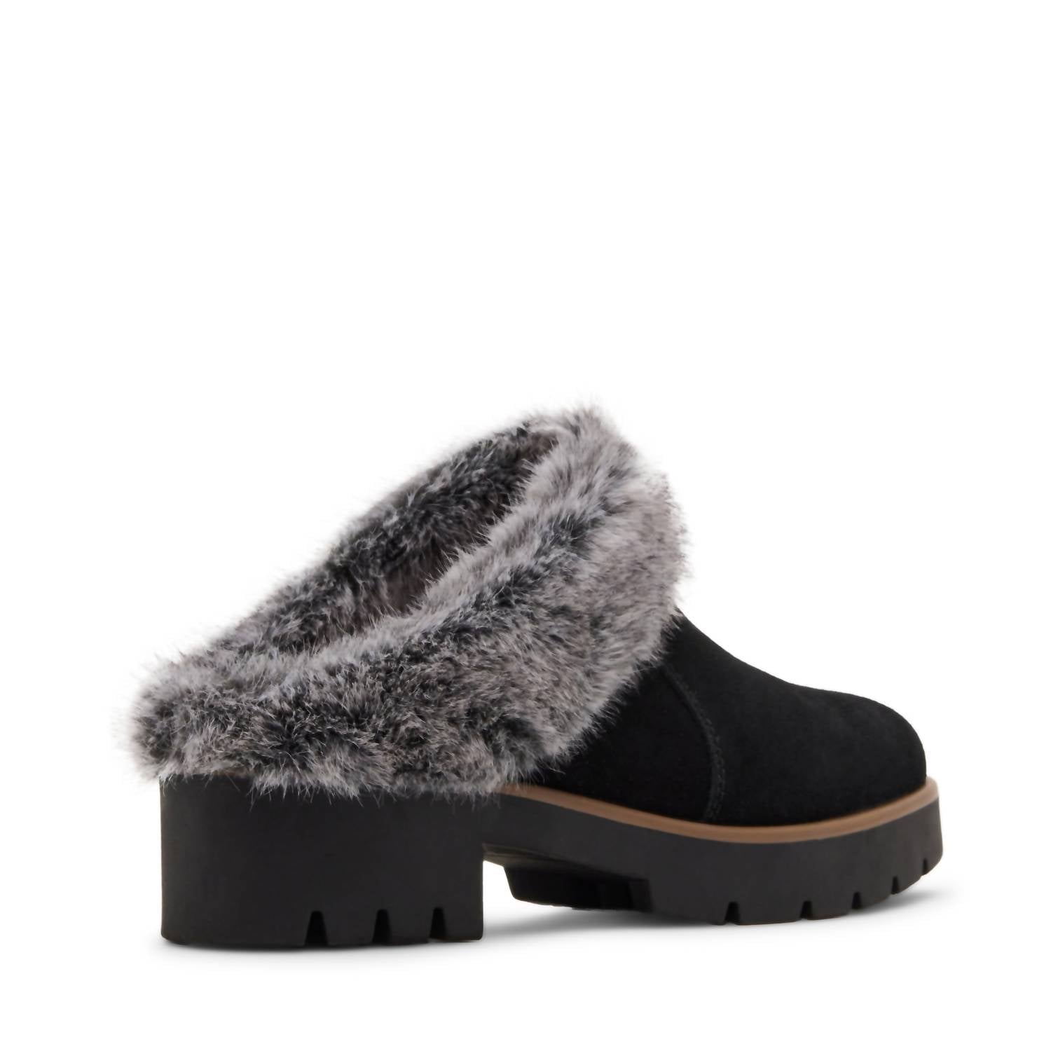 Introducing the Women's Karoline Water Resistant Mule by Blondo, an elegant choice in suede featuring a sophisticated faux fur upper and short lug heel for comfort. The 1.50-inch heel and almond toe shape ensure style and practicality, perfect for any occasion. Composition includes a suede upper, synthetic lining and sock, with a durable rubber sole. Care is a breeze, simply wipe with a damp cloth to maintain their pristine look. Ideal for women seeking a blend of chic design and functional wear.