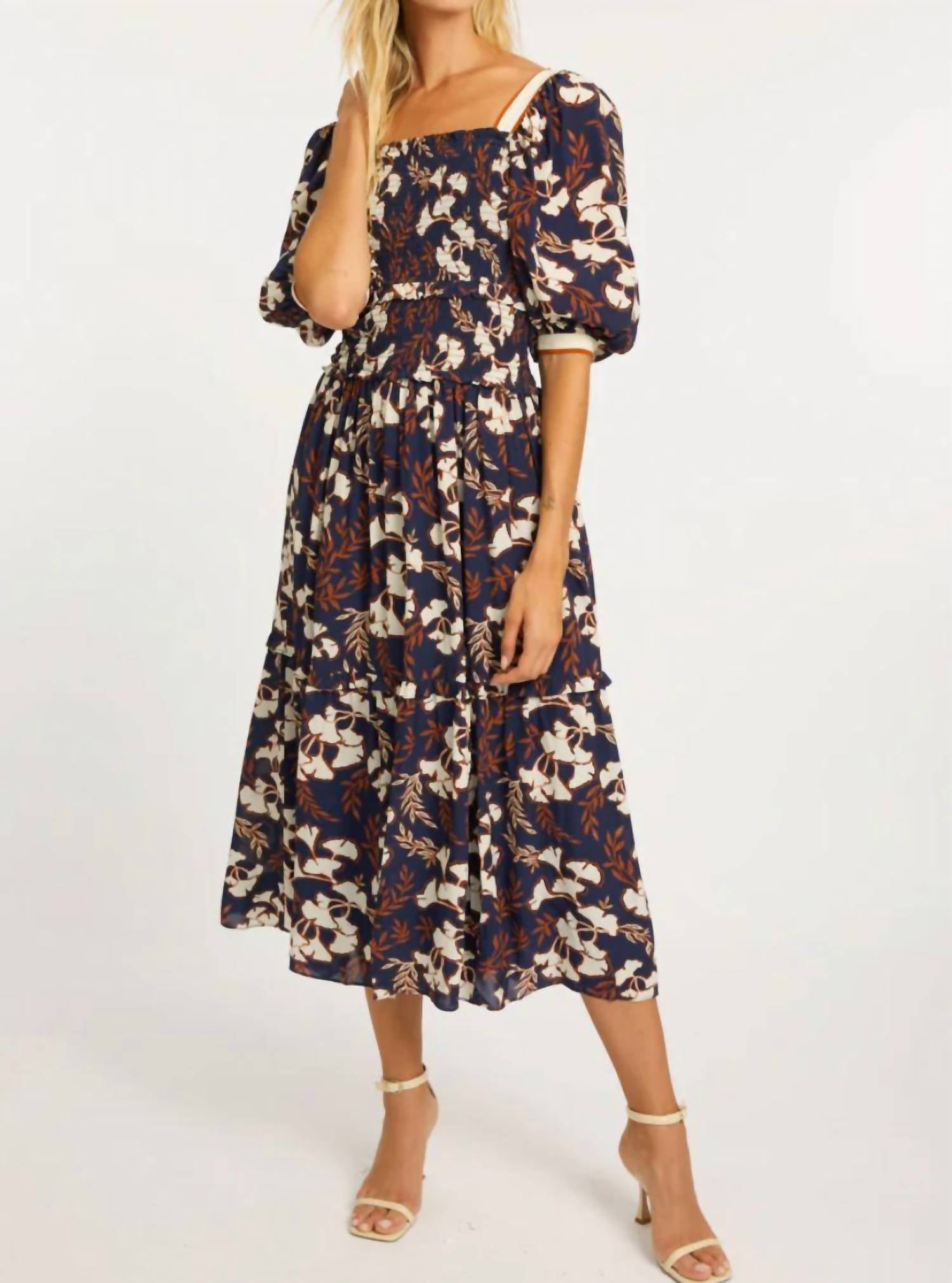 The perfect length dress does exist. Experience everyday elegance with the Oceane Puff Sleeves Midi Dress by CABALLERO, a chic choice for elevated style. This design features elbow sleeves and a square neckline, crafted from breathable viscose crepe with a stunning Ginko Block Print in floral patterns. The pull-on closure ensures effortless wear, while the tiered A-line silhouette offers a flattering flow. Care for this standout piece by hand washing and laying it flat to dry, perfect for any springtime occasion.