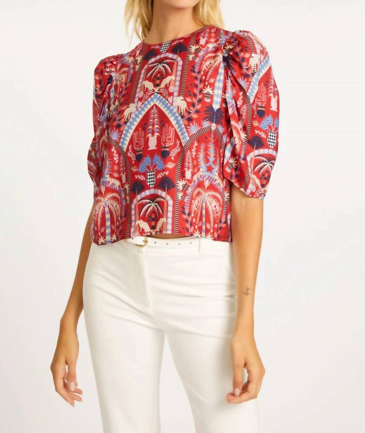 A versatile blouse that works from desk to dinner! Elevate your vacation style with the CABALLERO Robine Top in Ruby Tropics, a blend of vibrancy and sophistication. Designed with elbow-length ruched sleeves, this women's blouse is crafted from an 84% Viscose and 16% Silk blend, featuring a bold patterned print on a red backdrop. The straight fit and crewneck design make it a versatile choice for spring occasions, whether casual or preppy. Closure: Pull on. Care: Machine wash.