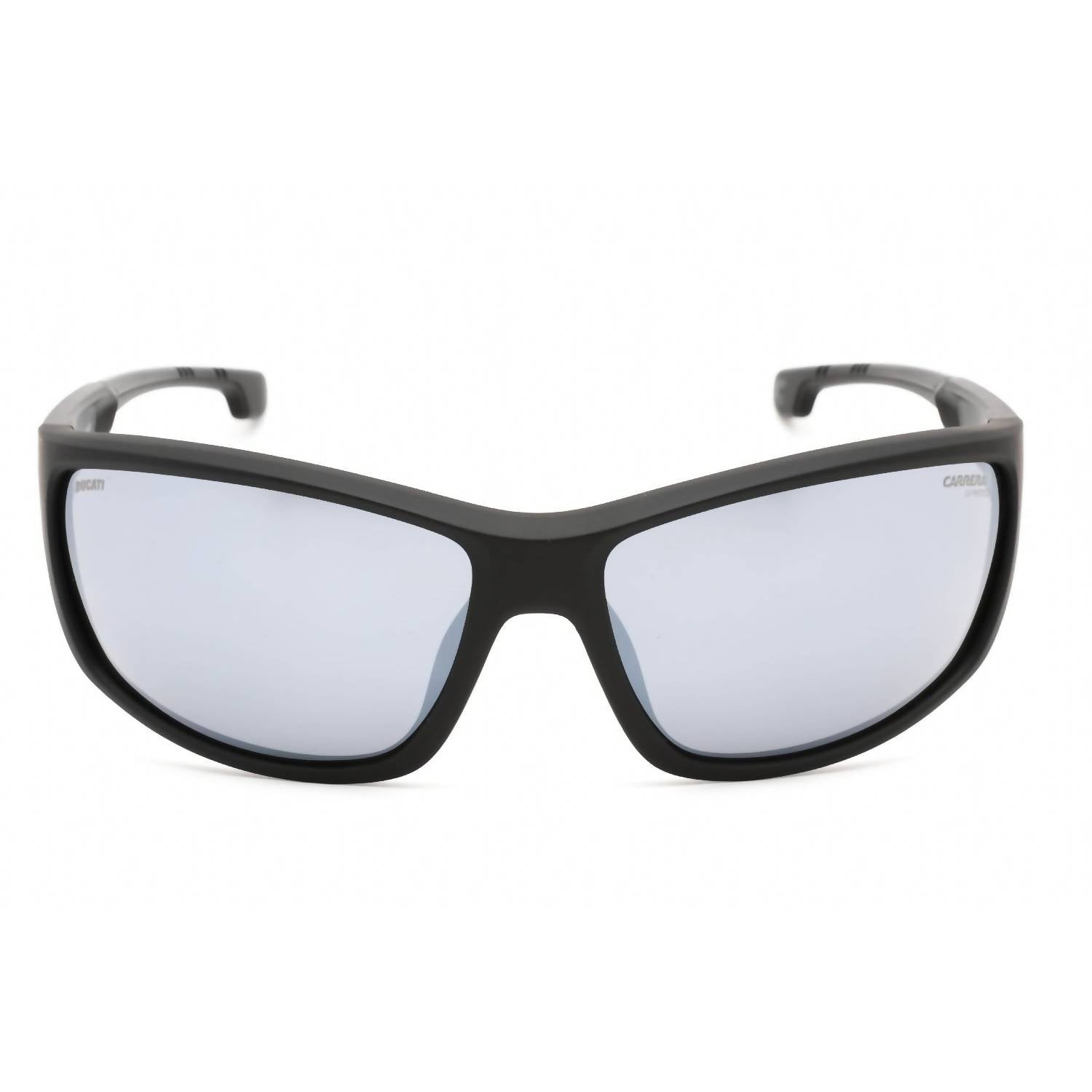 Introducing the MEN'S CARDUC 002/S SUNGLASSES by Carrera, where sleek style meets ultimate sun protection. These sunglasses feature a wraparound, full-rim design with a black grey polyamide frame and rectangle frame style, ideal for heart, oval, round, square, and triangle face shapes. The silver mirror plastic lenses provide Category 3 and 100% UV protection, making them both stylish and functional. Dimensions include an eye size of 68, a bridge of 16, and temple length of 125.