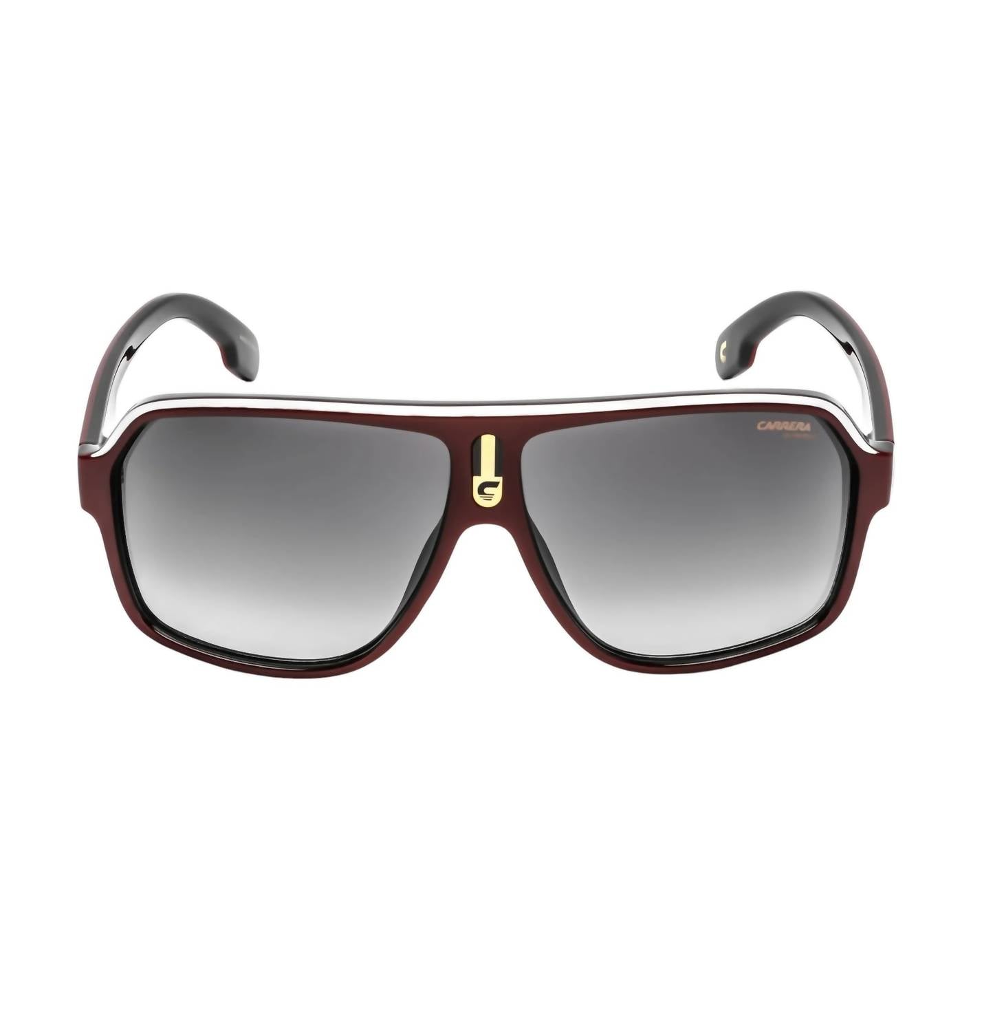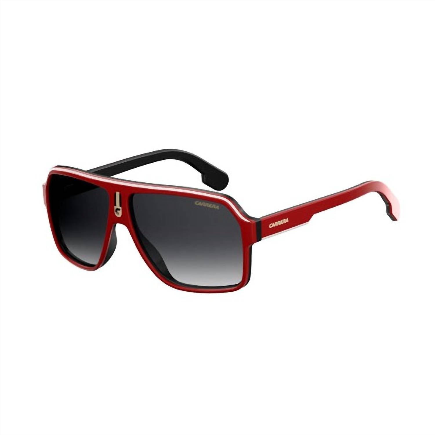 Introducing the MEN'S 1001/S Sunglasses by Carrera, a bold statement in eyewear. Crafted with a red black plastic frame, these full-rim sunglasses feature a striking rectangle, oversized, shield shape. The dark gray gradient lenses offer a modern edge, complemented by a lens width of 62 mm, a bridge width of 11 mm, and a temple length of 140 mm. Perfect for the fashion-forward individual seeking both style and functionality.