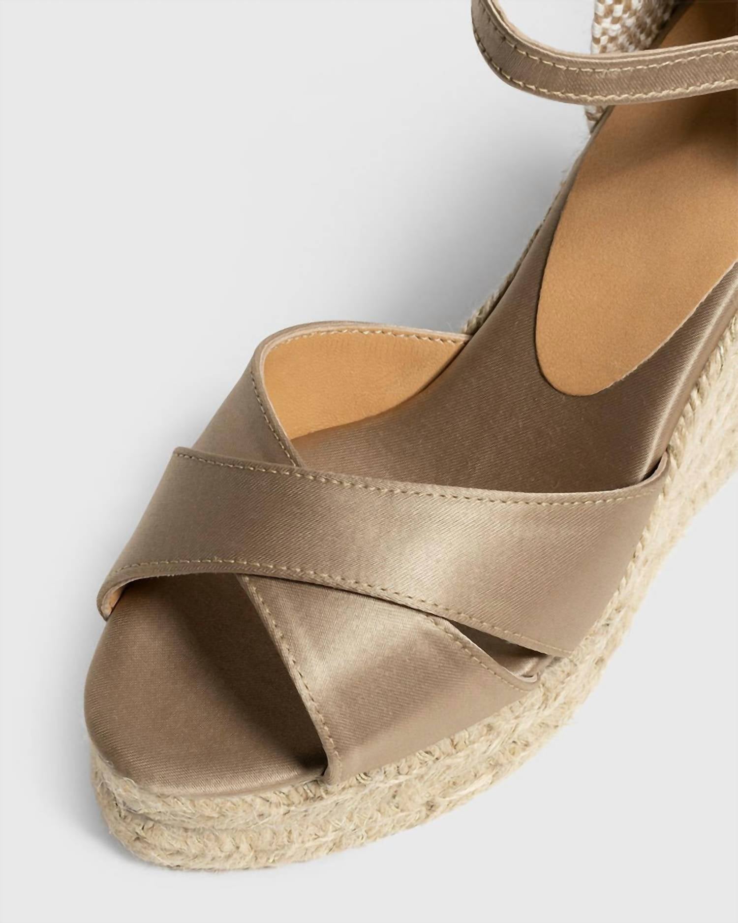 This sandal will take you from brunch to dinner and everything in between.Espadrille with wedge made in metallic satin. Sandal style design with ankle bracelet closure and round, open toe. Colorblock vulcanized rubber sole, 11cm height, 8cm wedge heel, and 3cm platform. Interior composition: 100% sheep leather. Exterior composition: 70% cotton, 30% polyester sole. Made in Spain.