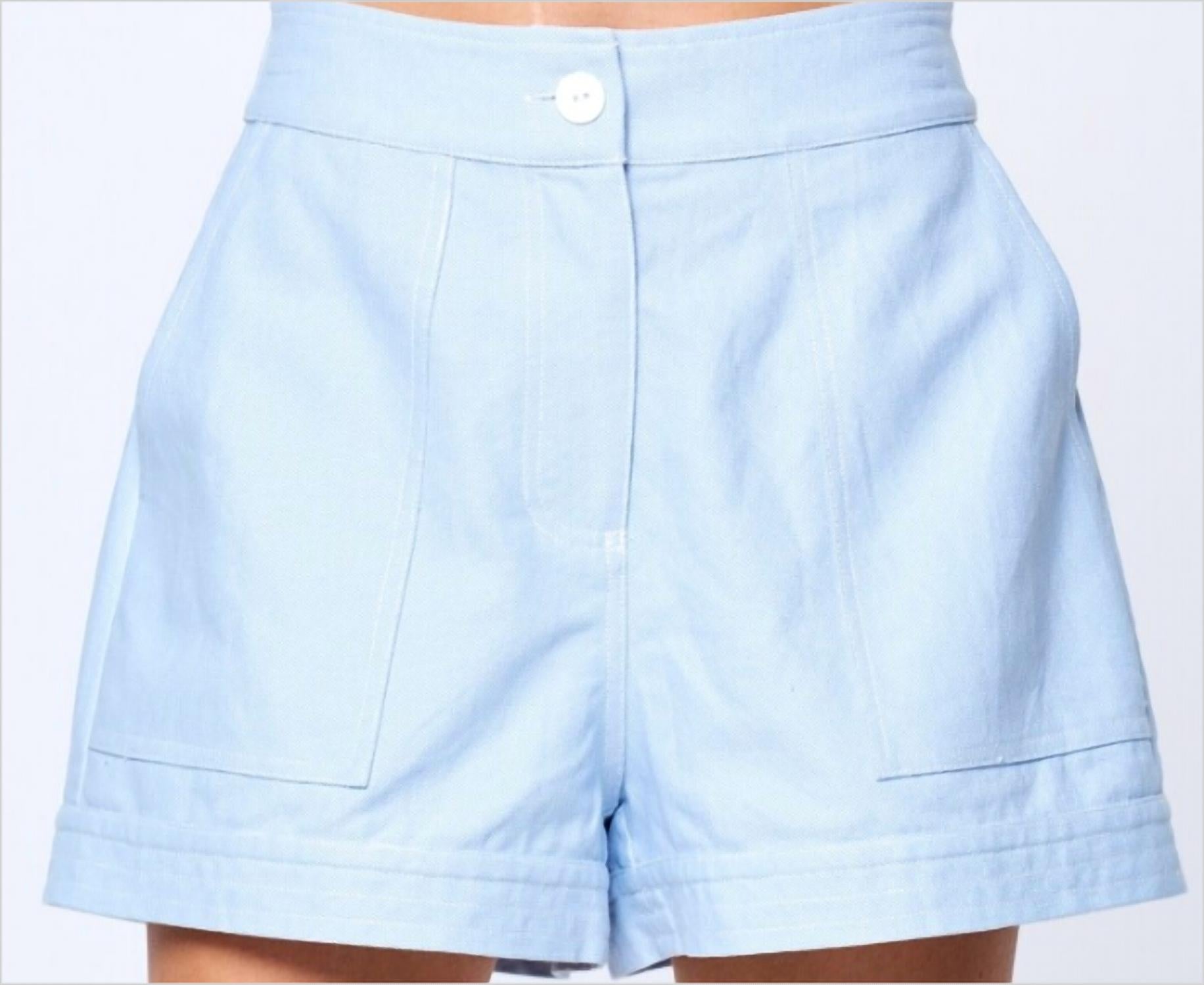 Fit to perfection, we love these high-waist shorts and you will too. Discover the CIEBON Women's Baby Blue Top Stitch Shorts, a chic addition for your summer wardrobe. These high-waist shorts feature a solid pattern in a refreshing blue hue. Closure: Button Closure. Perfect for vacation, these shorts come with pockets for added convenience.