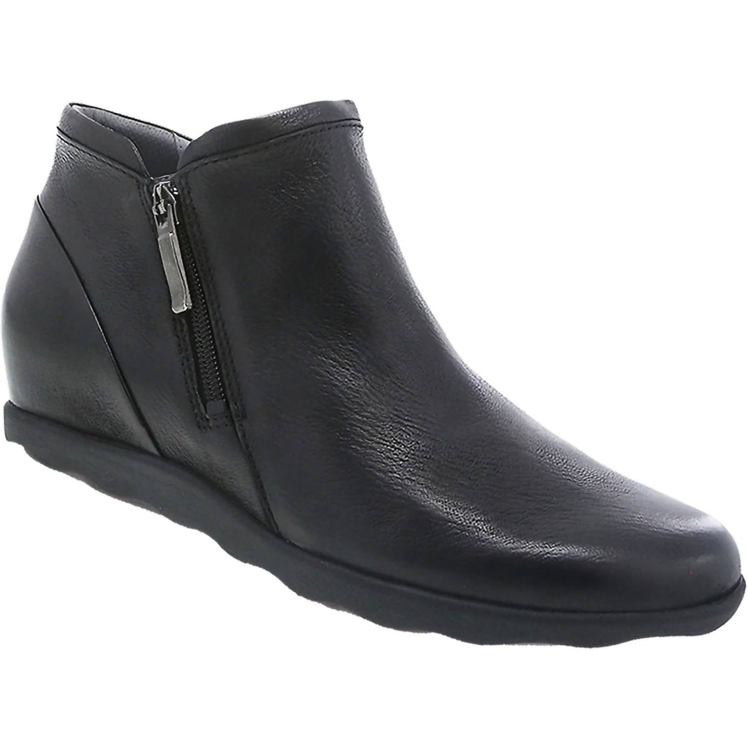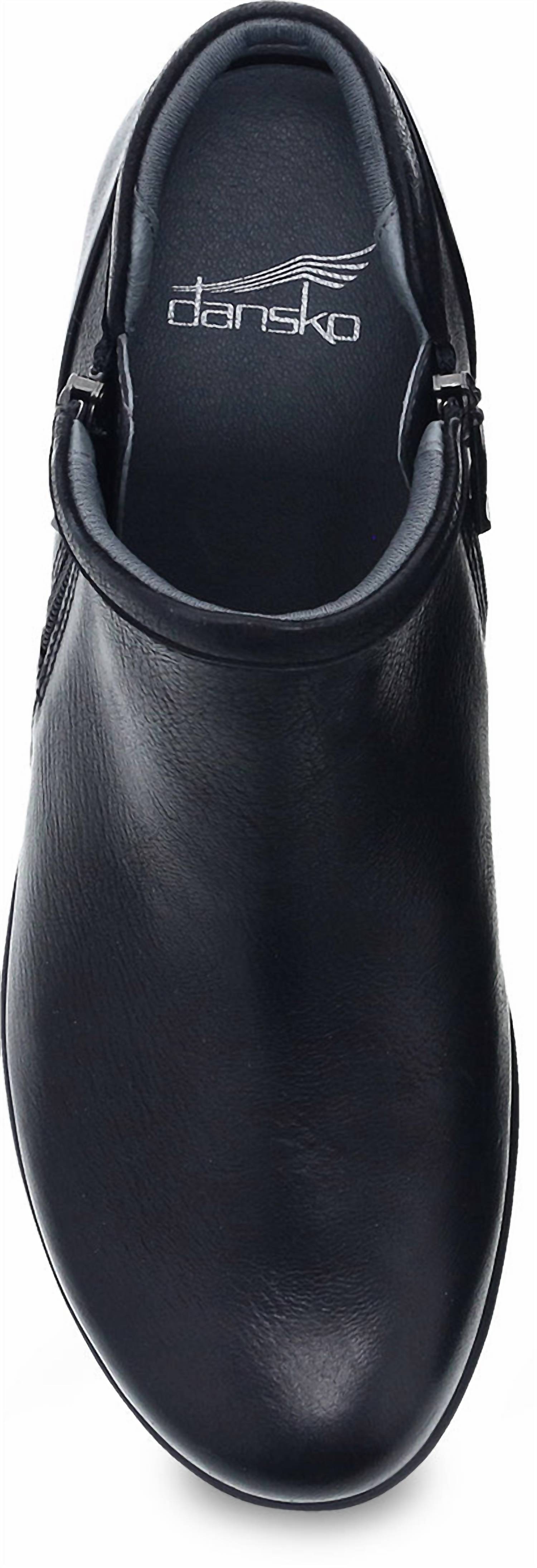 Step into comfort and style with the Dansko Women's Miki Ankle Bootie, a streetwear-inspired design in classic black leather. Crafted for lasting wear, these booties feature dual side zippers and a chrome-free leather-covered, removable EVA footbed equipped with memory foam and Natural Arch technology for enhanced support. Lined with a combination of chrome-free leather and 100% recycled textile lining with Aegis Microbe Shield odor control, these booties provide all-day freshness. Ideal for casual summer outings or back-to-school moments, the lightweight construction and hidden wedge ensure you stay both trendy and comfortable.