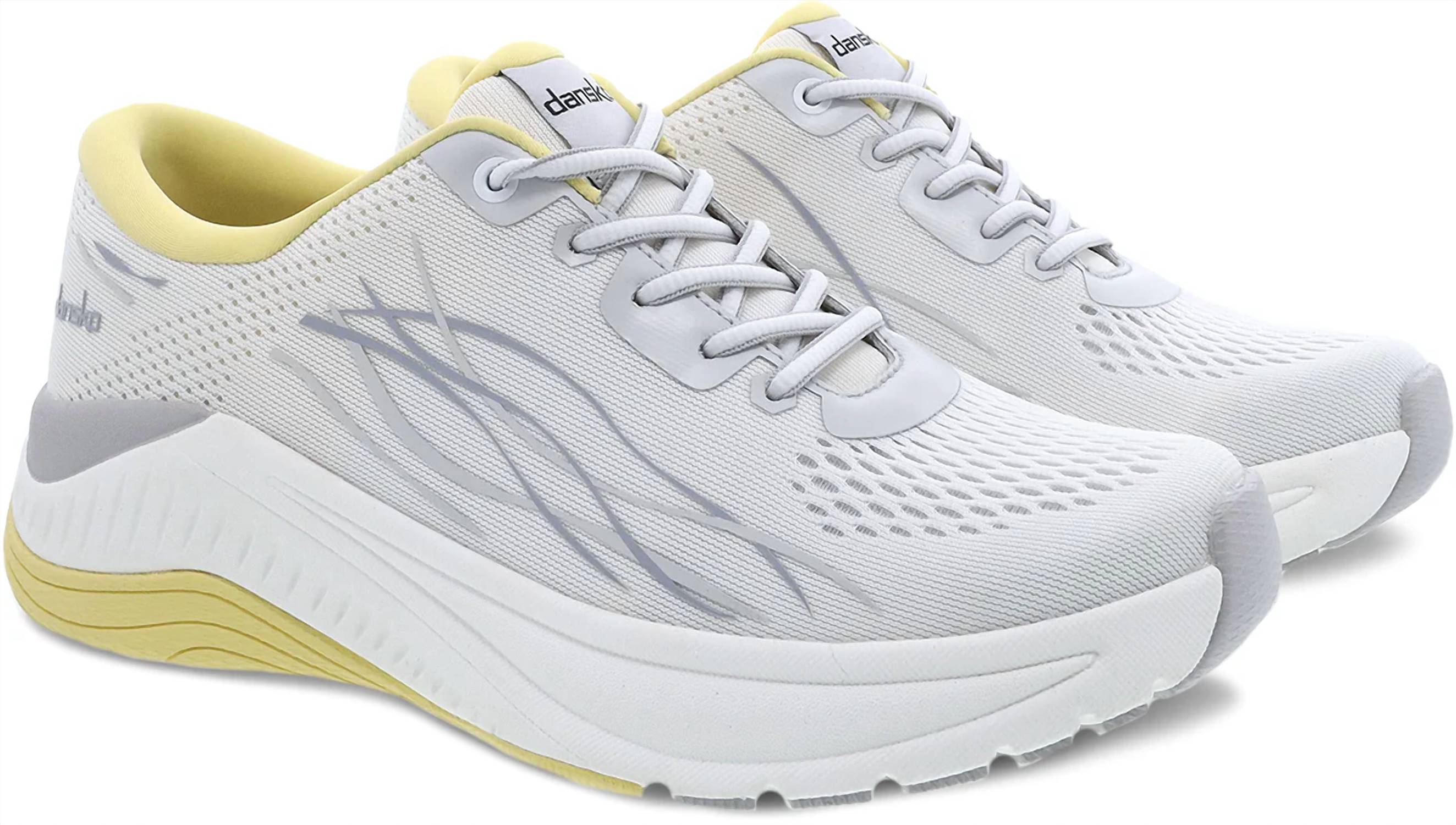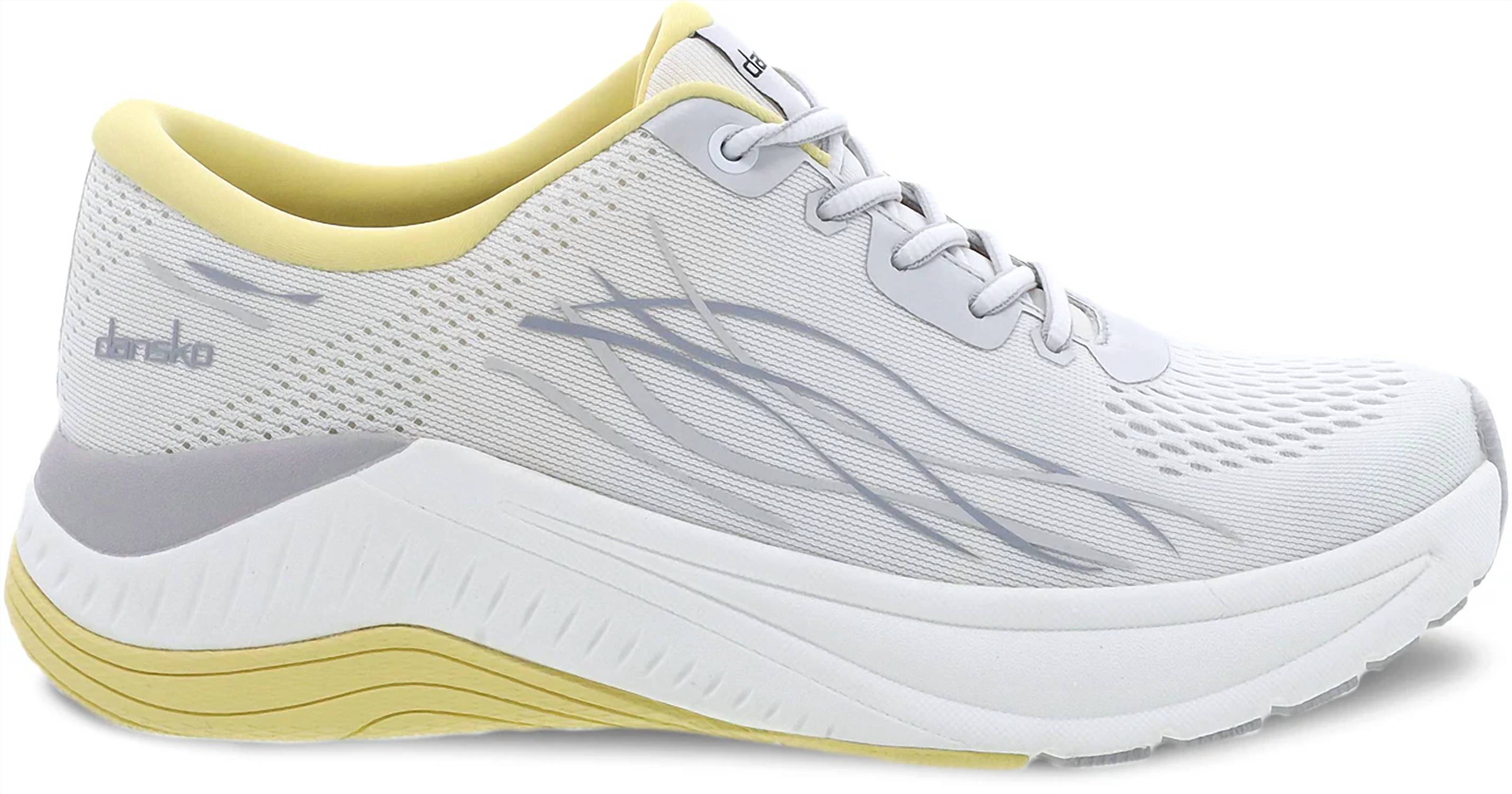 Stylish, comfortable and supportive. These athletic sneakers check all of the boxes. Step into unparalleled comfort and style in a chic white/yellow colorway. Designed with meticulous attention to detail. Feature a platform heel complemented by a round toe shape. Construction boasts textile linings and mesh uppers made from recycled materials, treated for odor control and stain resistance. Enhanced with Dansko Natural Arch Plus technology. Provide superior arch support and stability, while the energy return EVA footbed, cushioned midsole, and durable rubber outsole ensure lasting performance.