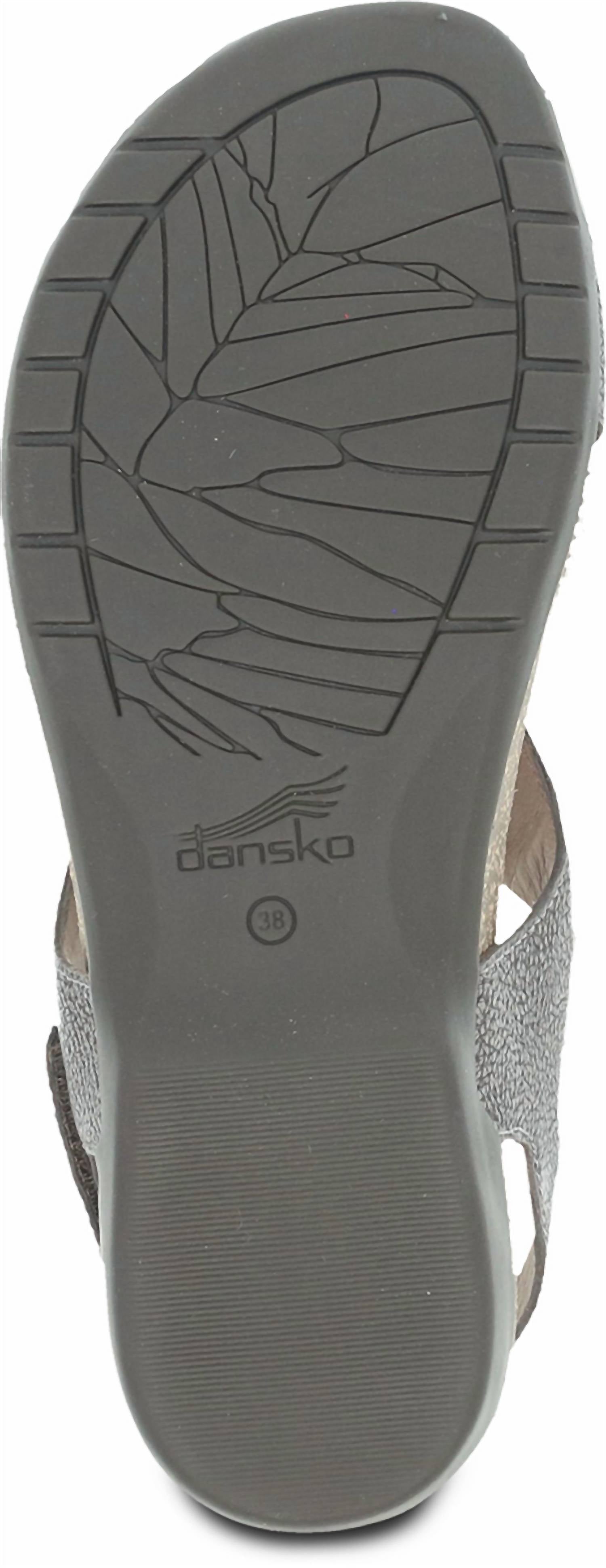 This sandal will take you from brunch to dinner and everything in between. Step into style with the Women's Reece Sandals by Dansko, a perfect addition in shimmering Pewter Metallic. Crafted with premium leather uppers and linings, these sandals promise all-day comfort and breathability. The molded memory foam footbed, coupled with a lightweight EVA and cork midsole, ensures a cushioned stride. Durable rubber outsoles provide lasting wear, while the round toe and flat heel cater to effortless grace.