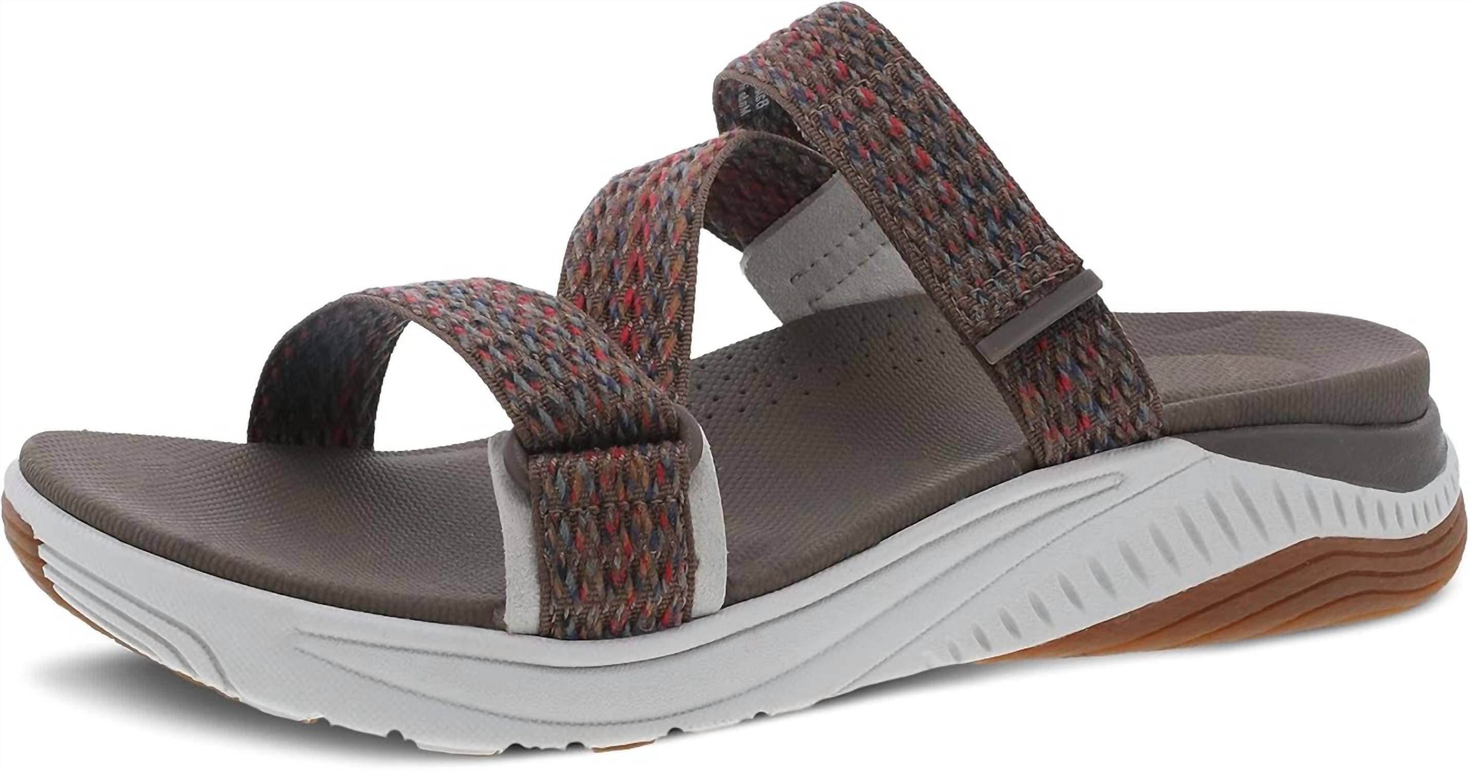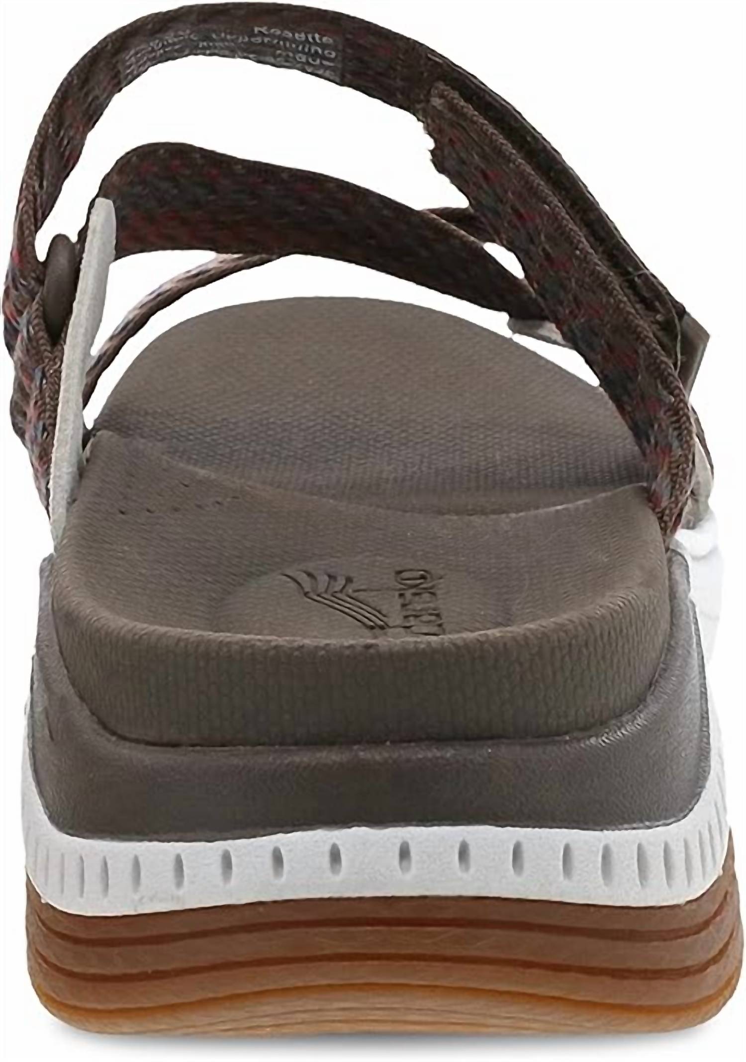 Classicly cute and all-day-wearable. We love this sandal. Introducing the Women’s Rosette Webbing Slip-on Sport Sandal by Dansko, expertly designed for all-day comfort and style in Brown Multi. With an open back and a lightweight EVA midsole, this sandal features recycled webbings and multiple points of hook and loop adjustability for a customized fit. The energy return EVA footbed with Dansko Natural Arch technology ensures superior support, complemented by a Propel forepart and a high abrasion rubber outsole. Ideal for women seeking low, flat-heeled footwear with a round toe shape, perfect for diverse adventures.