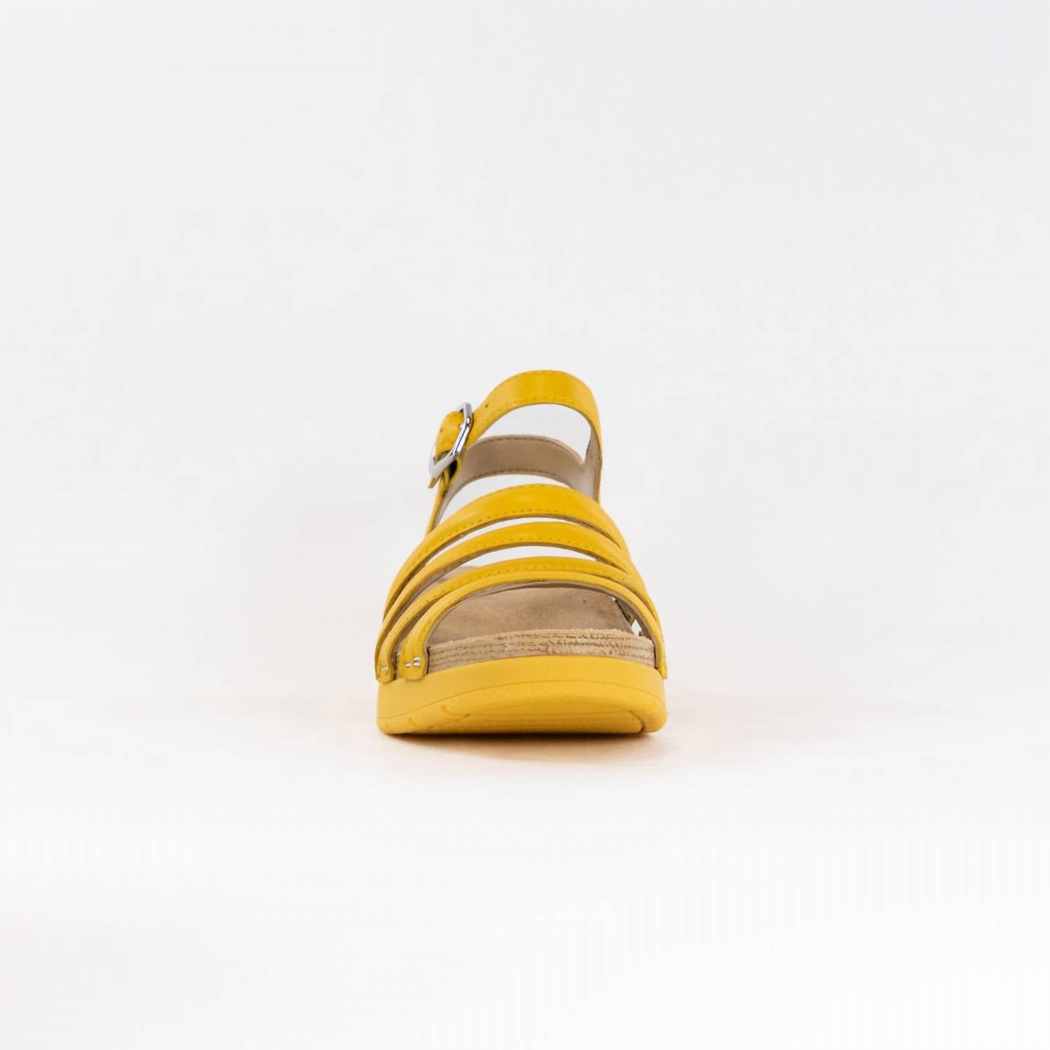 This sandal will take you from brunch to dinner and everything in between. Step into summer style with Dansko's Women's Roxie Sandal in a vibrant yellow hue. Crafted from high-quality leather, this sandal features simple straps that make it perfect for showcasing your style during vacations or special occasions like Easter. Built for comfort with a patented stapled construction, it includes soft linings and a chrome-free suede socklining for an all-day wear experience. The sandal boasts a cushioned energy-return PU footbed and a midsole of contoured BPU, finished with a flexible TR rubber outsole to ensure lightweight, comfortable steps.