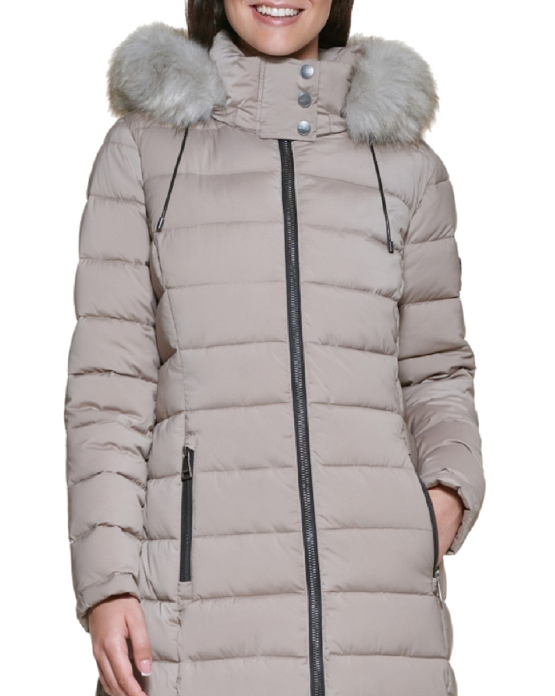 Mix up your look on those extra chilly days in this maxi-length puffer coat from DKNY designed with gorgeous faux-fur trim on the hood