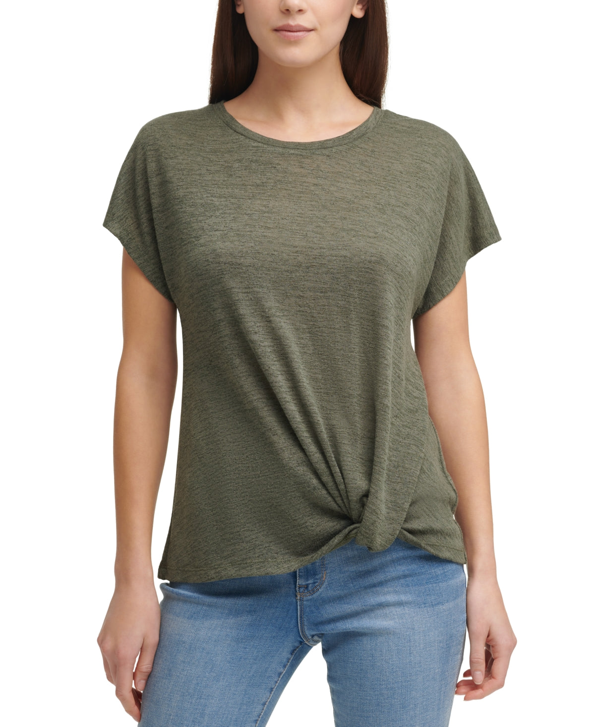 Fit to flatter with a cute front knot and nubby knit texture| this comfortable DKNY top delivers plenty of styling potential.| Crewneck| Imported| Dolman short sleeves| Knot detail at side front hemline|