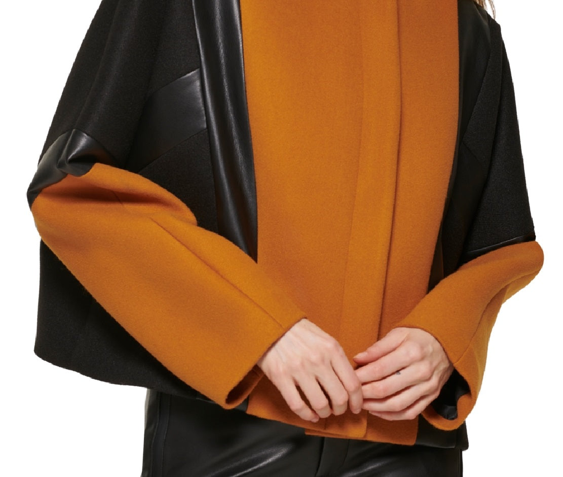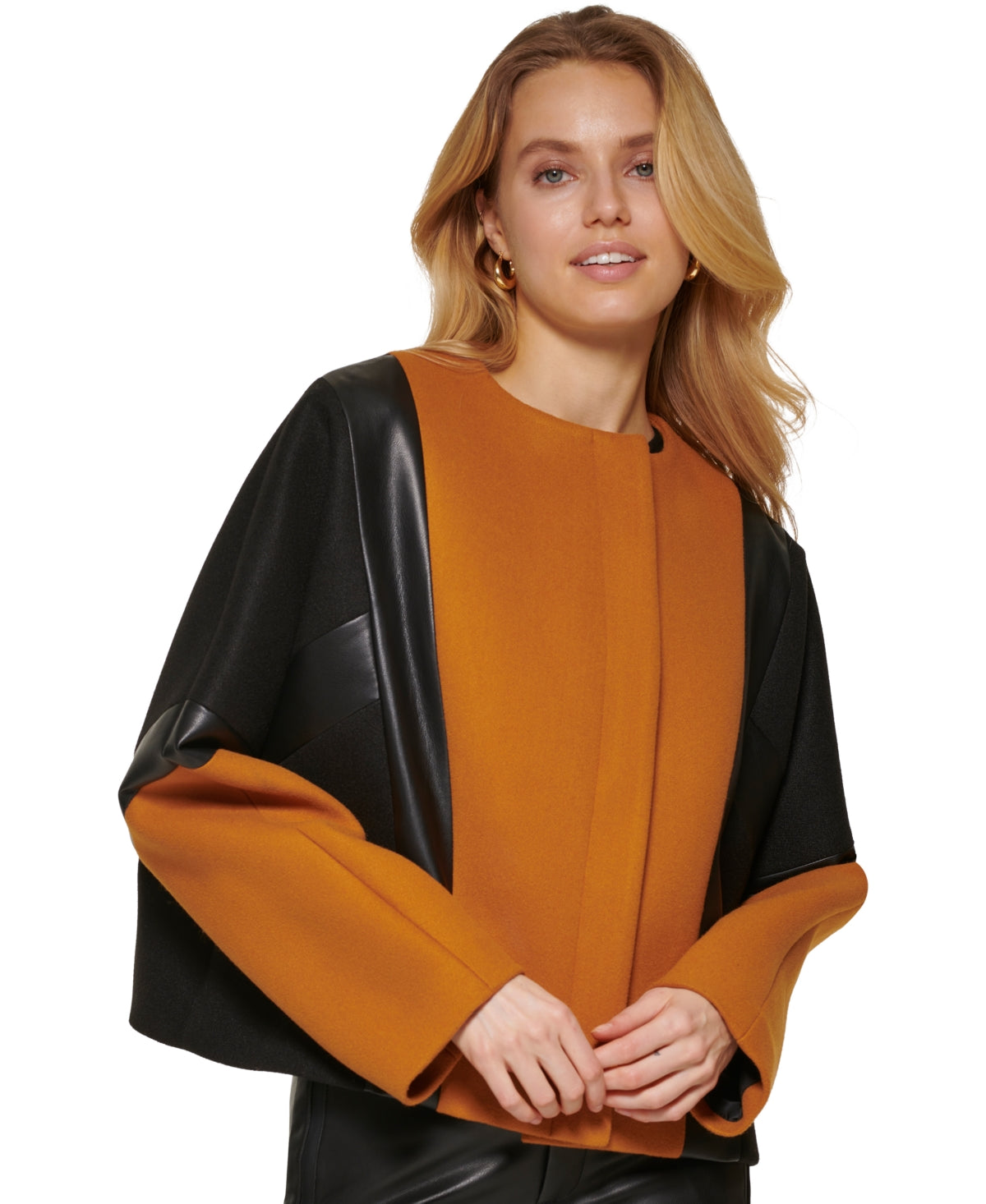 DKNY upgrades the faux-leather hero jacket in a sleek colorblock shape for a stylish look that never quits|