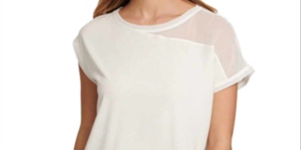 Chiffon accents polish this DKNY top| a fresh take on the classic T-shirt| An asymmetrical hem completes the piece