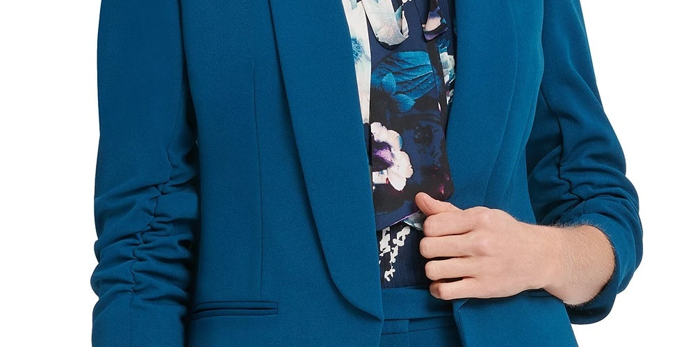 Approx. length: 25"|Designed to fit and flatter 5'4" and under frame|Shawl collar; open front|Shoulder pads|Welt pockets|3/4-length ruched sleeves