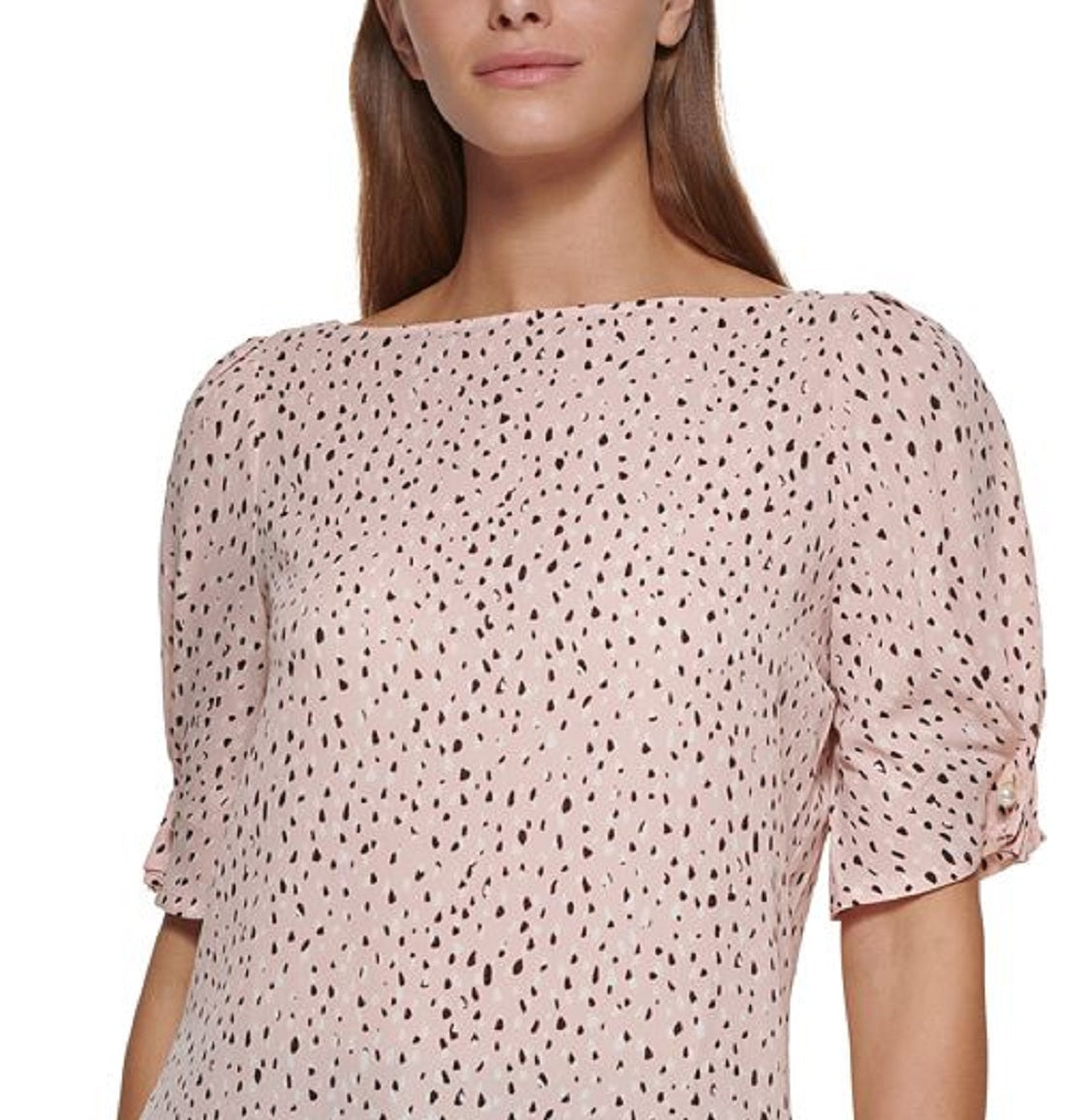 DKNY amps up your workday style with this printed blouse| detailed with imitation pearl buttons and gathered accents on the sleeves.| Approx. 24 long| Boat neckline| Elbow-length sleeves with imitation pearl buttons and gathered accents| Polyester