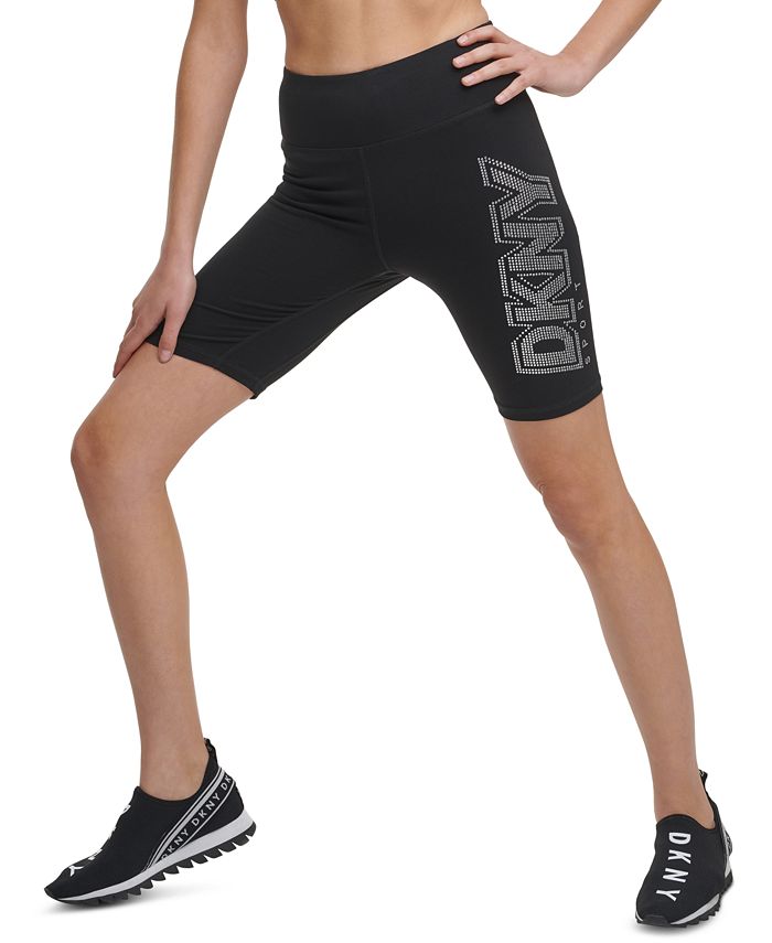 Show off your power moves in these DKNY bike shorts| a sleek high-rise silhouette with a glistening logo.| High rise; approx. inseam; 8| High waist enhances coverage| Rhinestone logo| Cotton/elastane| Machine washable