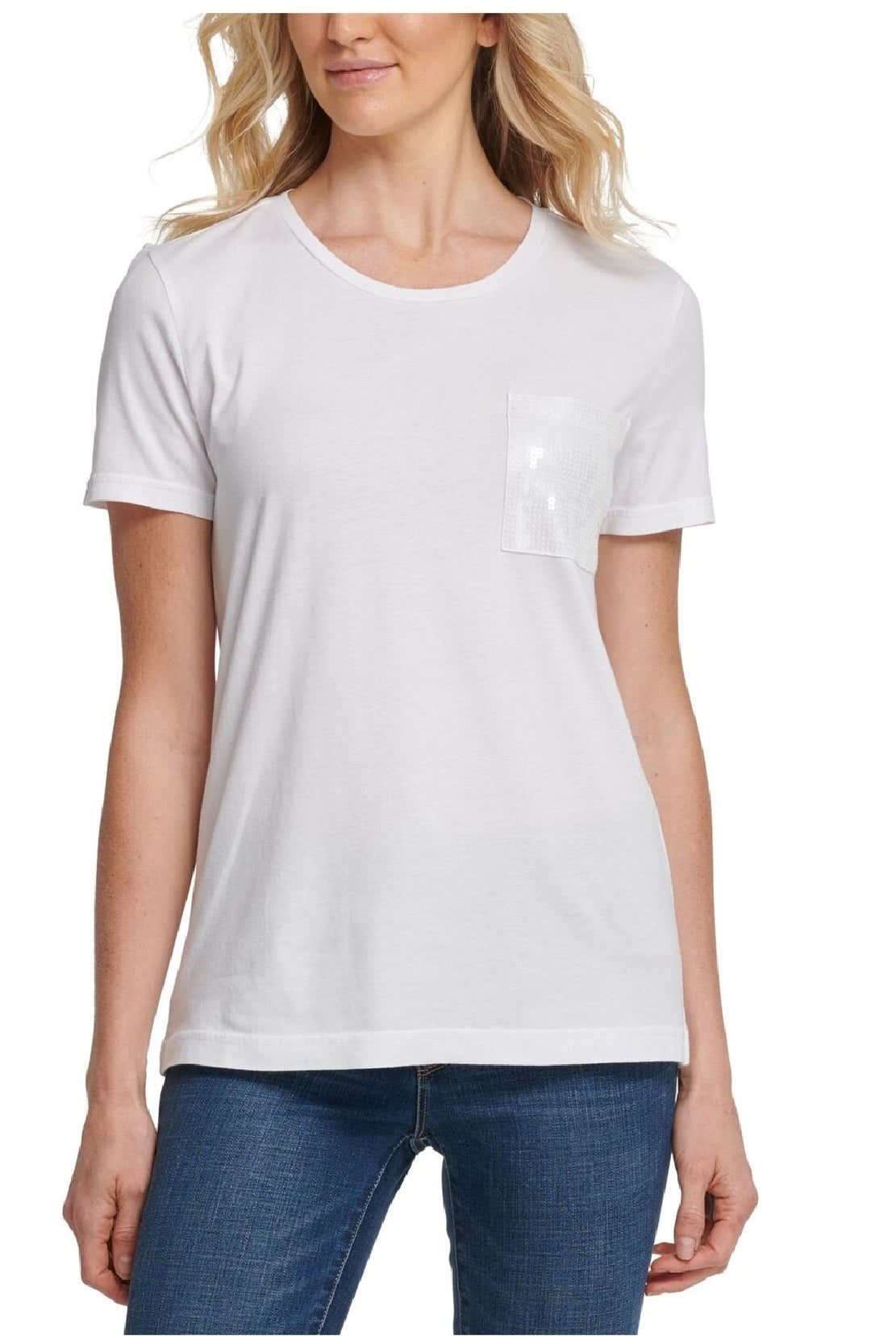 A pocket at the front of this cute T-shirt from DKNY comes alive with an array of sparkling sequins.| Crewneck| Sequined pocket at front| Cotton/modal| Hand wash| Imported