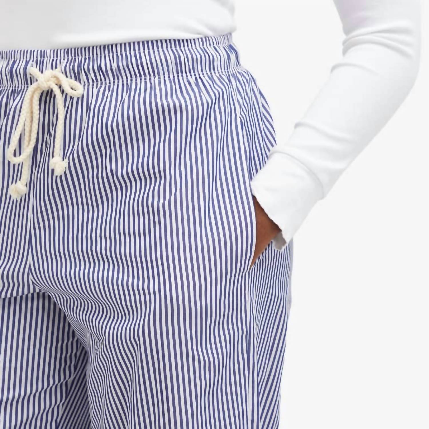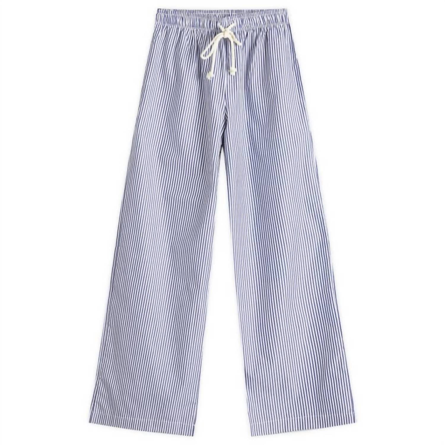 Introducing the Women's The Stripe Pop Pant by DONNI., a chic addition to your wardrobe in a sophisticated navy stripe. Crafted from premium cotton, these trousers showcase a classic pinstripe pattern with a wide, straight-leg fit for timeless appeal. Featuring a comfortable drawcord waist and practical pockets, they offer a convenient pull-on closure. Perfect for vacation or streetwear, maintain them with ease through machine washing.