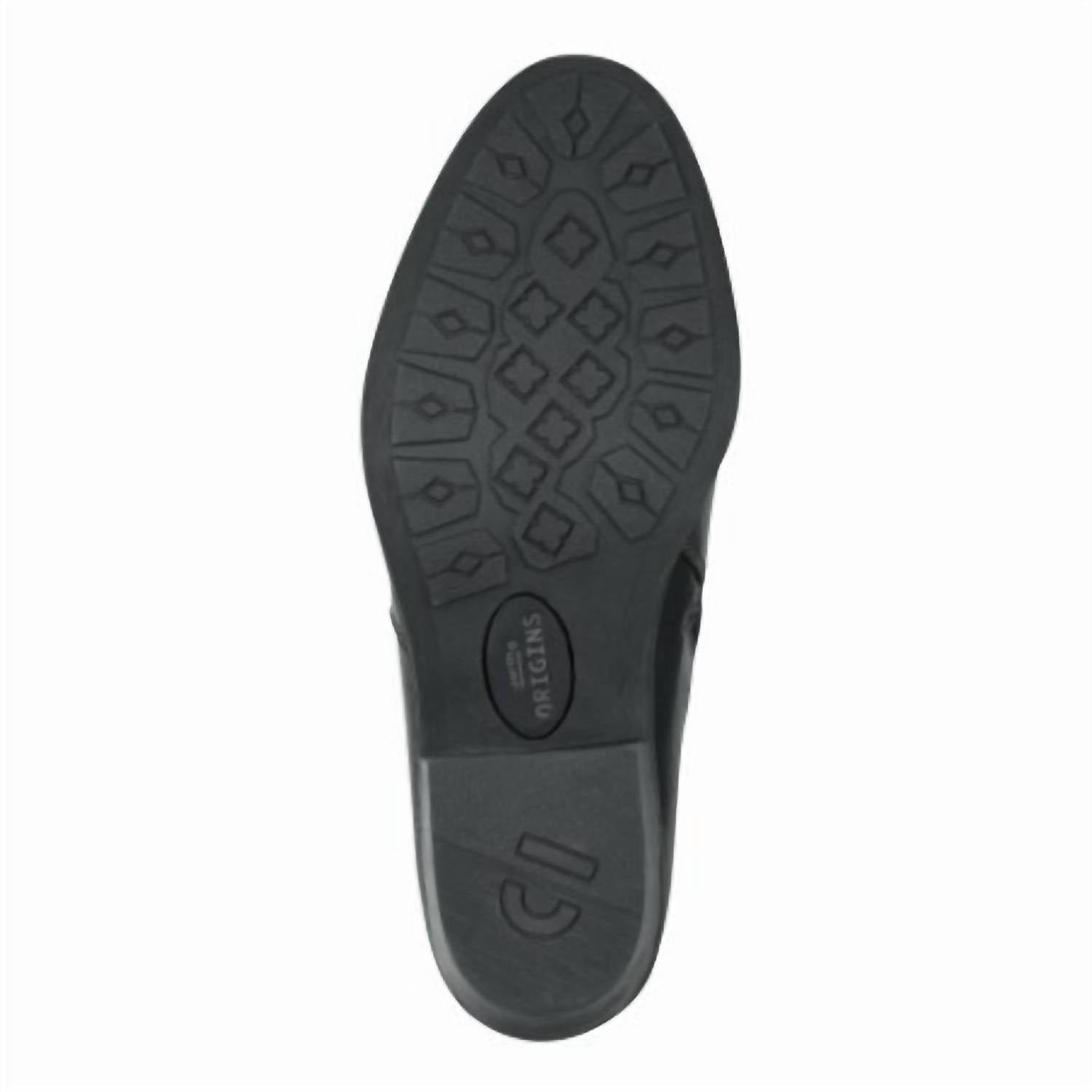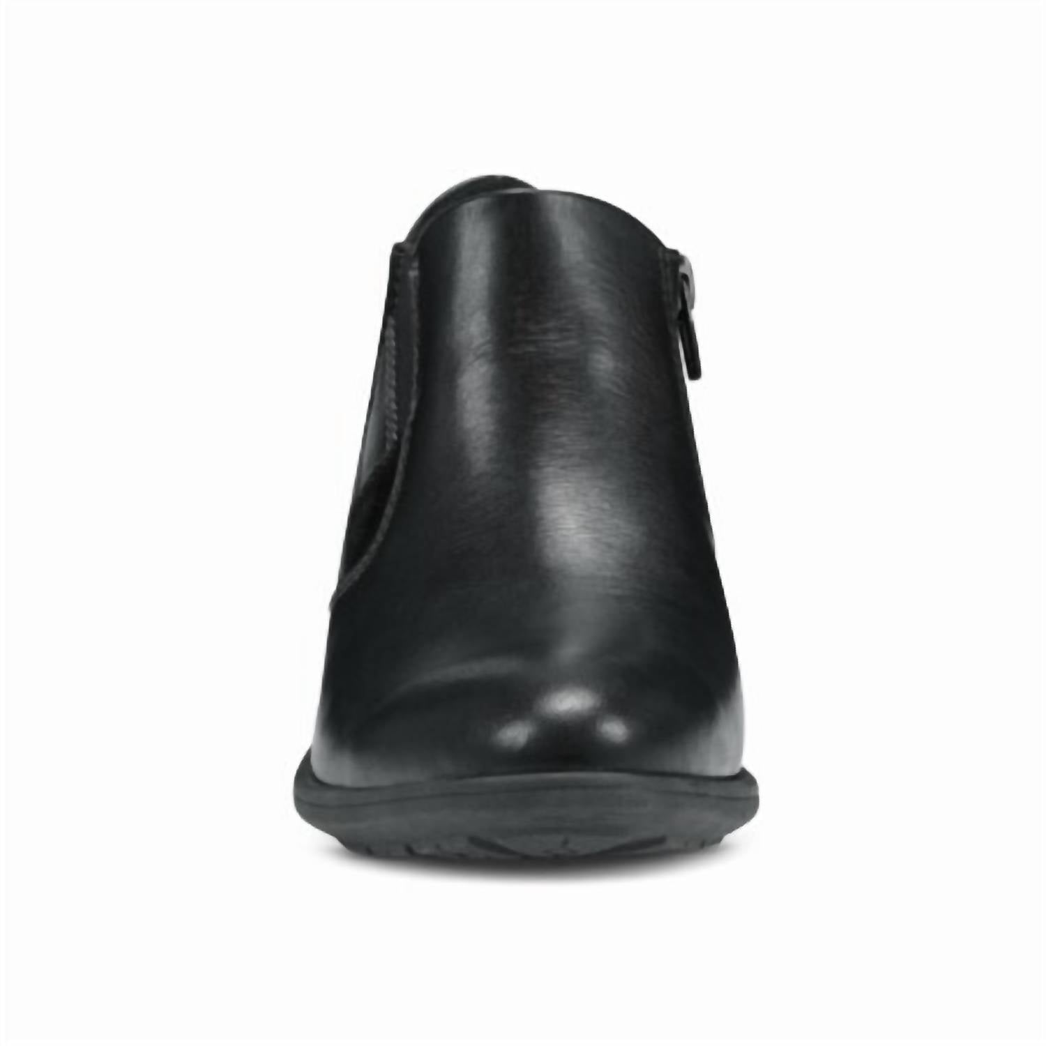 Say hello to the perfect, most versatile boot. The ankle height makes this style easily transition from day to night. Wear them with your favorite skinny jeans and tee for a more laid back look, or pair them with your favorite mini dress and jacket for a night out on the town. Step out in style with the Women's Christine Ankle Bootie by EARTH, crafted from premium black leather. This bootie showcases an almond toe and features artful patchwork that exquisitely cascades down the side, creating a stunning visual effect. A pull-on style makes it both effortless and chic, perfect for a variety of outfits. Whether you're dressing up or down, these booties ensure comfort and sophistication.